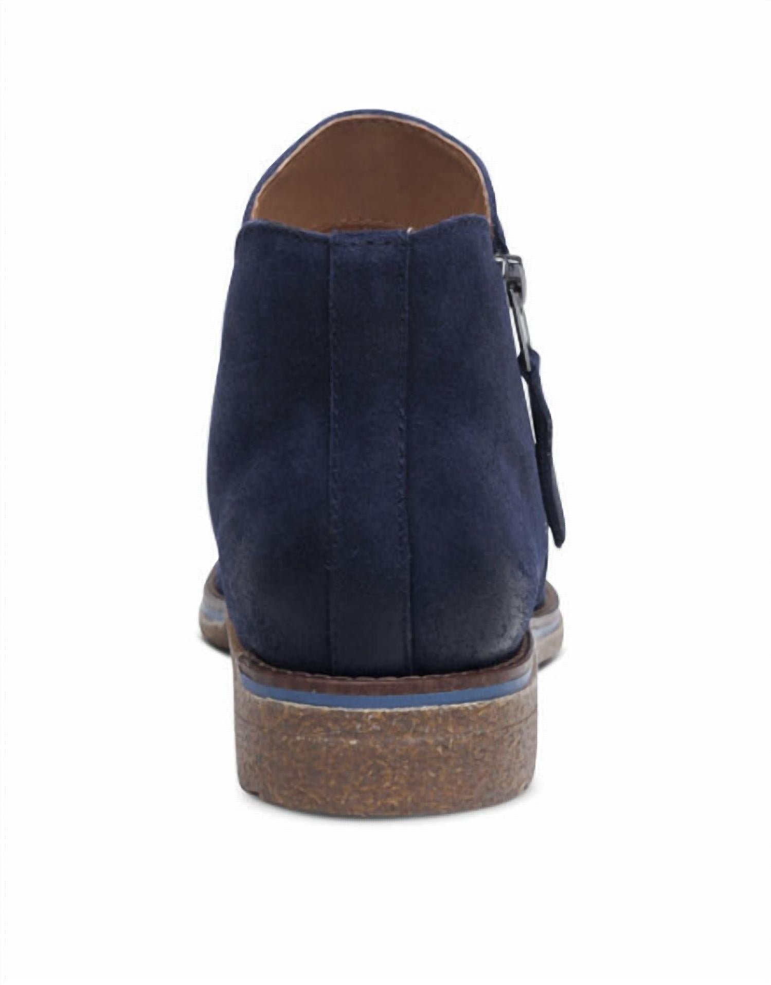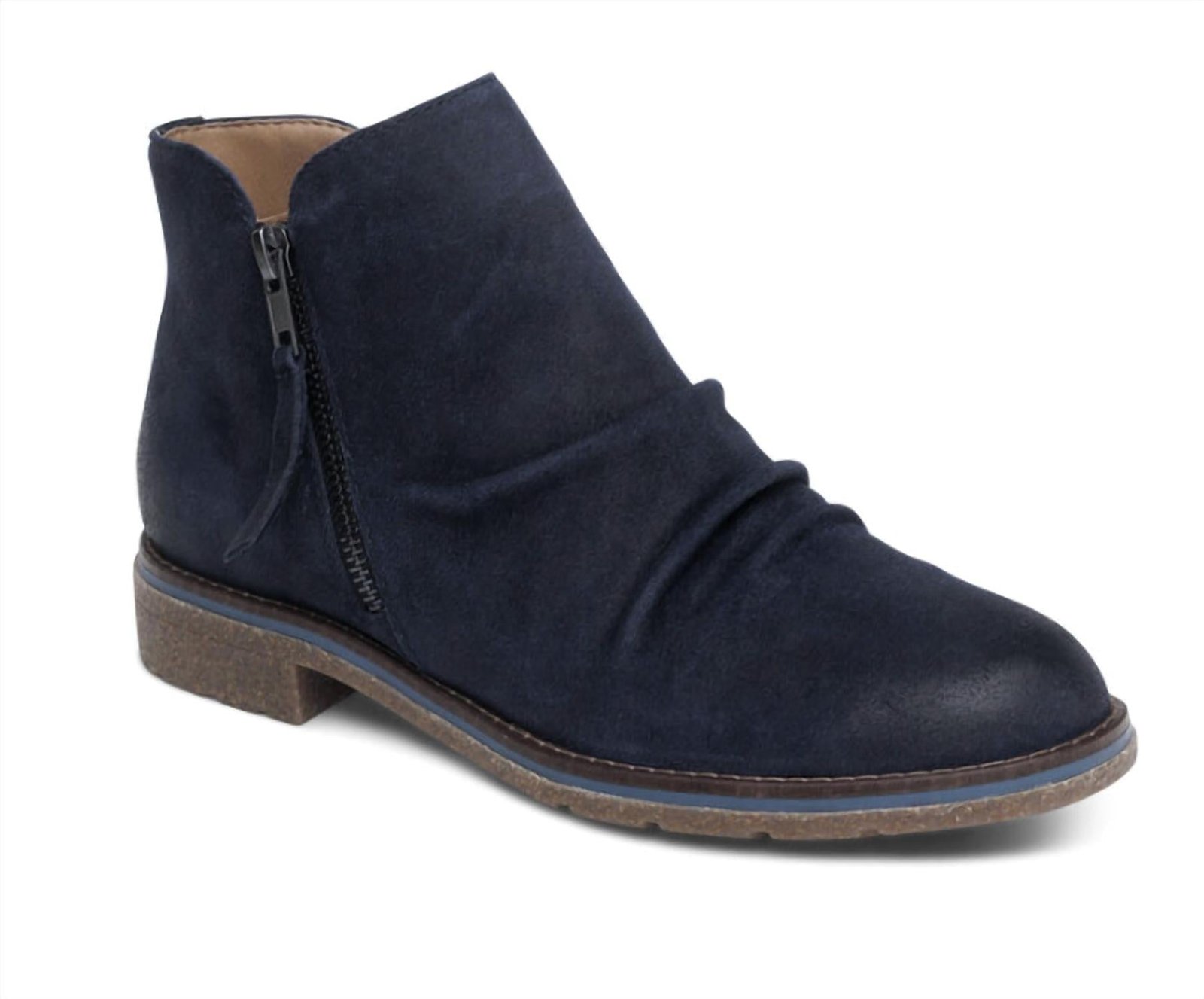 Upgrade your shoe game with these classic heeled boots, designed to merge sophistication and style. Comfortable enough for long days or a night out on the town.Step into style with the Women’s Mila Boot by Aetrex, a fall essential in trendy Western design. Crafted from weatherproof genuine leather in a deep navy shade, these ankle boots feature a chic ruched vamp and are finished with a chunky 1.25′ heel. They’re designed with a convenient side zipper and stretchy gore for excellent adjustability and fit. Boasting a durable rubber outsole, lightweight cork midsole, and removable insole, these boots offer superior arch and underfoot support, perfect for camping adventures.