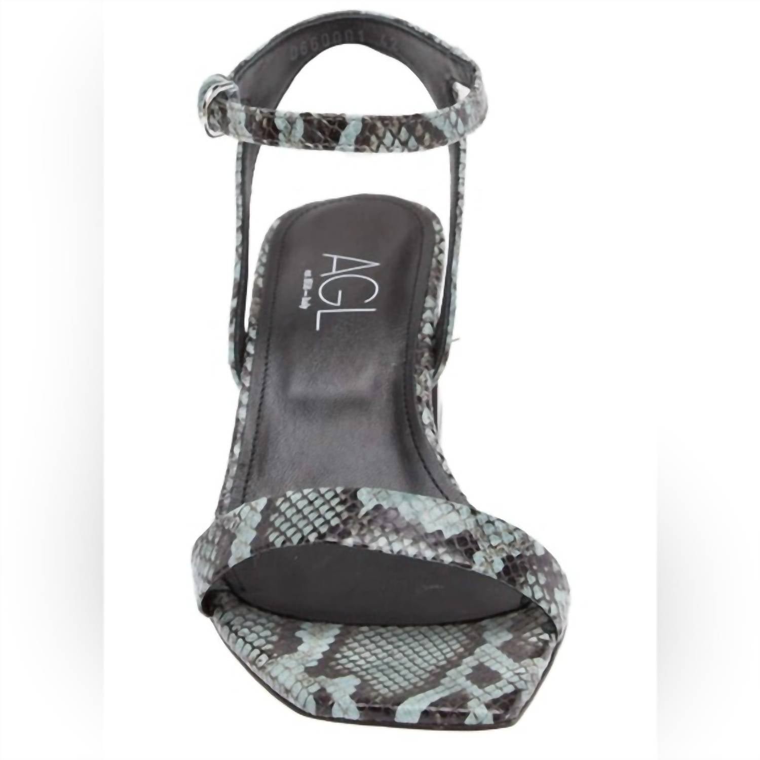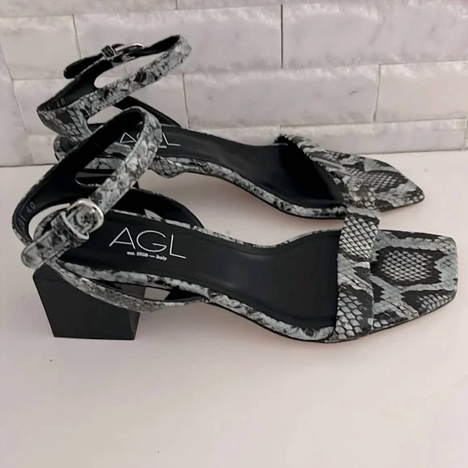 Classicly cute and all-day-wearable. We love this sandal.Step up your style with the Women’s Angie Ankle Strap Sandal by AGL, an epitome of refined Italian craftsmanship. The shoe features a striking blk/blue snakeskin leather upper and lining. The squared sole complements the innovative cube-shaped chunky heel, offering a low height of 1 1/4′-2′. Perfect for a workwear trend or an anniversary occasion, these sandals are your go-to choice this Spring and Thanksgiving.