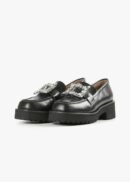A classic loafer that is both comfortable and polished.All Black introduces the Women’s Elton Lugg Loafer in sophisticated black, offering both style and comfort. This loafer boasts a leather upper with a striking large rhinestone buckle for a touch of glam, and has a slip-on design. With a 2-inch chunky heel and a squared toe, it’s perfect for leisurely strolls or stylish outings. Made in China, this piece features a lightly cushioned footbed and a durable lug outsole for reliable support and traction.