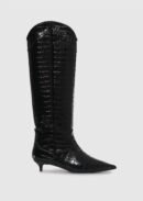 These over the knee boots are equal parts classic and cool.Step out in style with the ANINE BING Women’s Tall Rae Boots, designed to make a statement with their knee-high silhouette. Crafted from 100% cow leather in a sleek black faux croco-embossed texture, these boots feature a pointed toe and elegant 1.75′ kitten heel for a touch of sophistication. Made in Turkey, they incorporate a slip-on design accented with gold-tone hardware and an anti-slip sole for practicality. Material: 100% Cow Leather. Spot clean.
