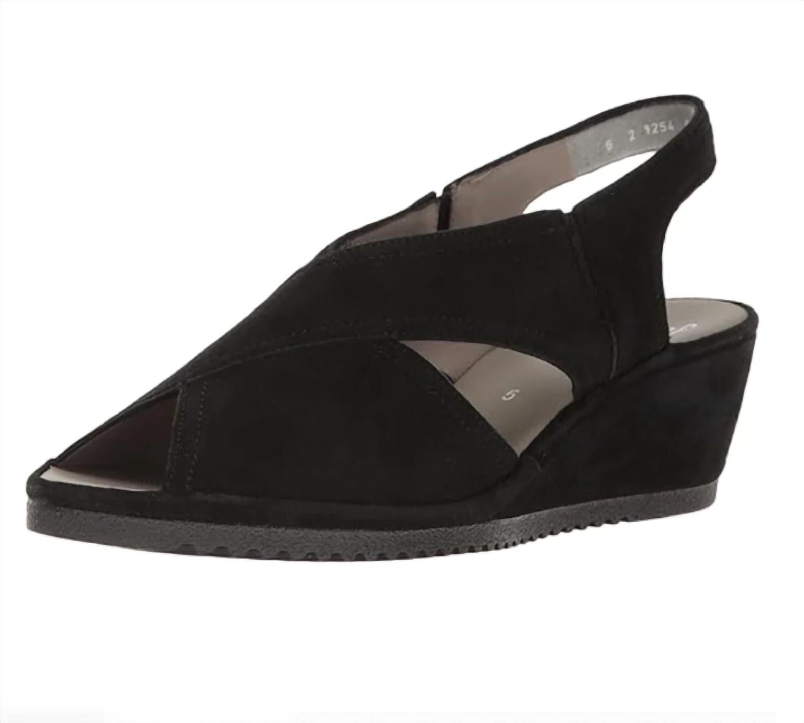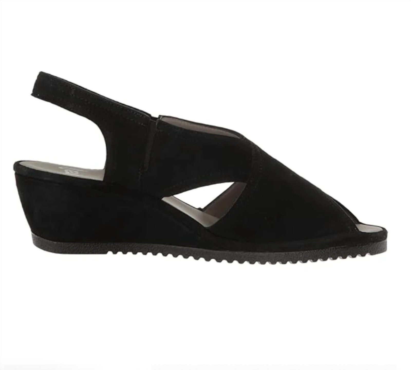 This sandal will take you from brunch to dinner and everything in between.Step into elegance with the Women’s Camila Suede Sandal by Ara, crafted in a sophisticated black hue. These sandals feature a luxurious suede material, offering a comfortable peep toe design that complements any summer outfit. The .5-inch wedge heel adds a subtle lift, perfect for stylish strolls. Ideal for women, this sandal blends sleek style with everyday comfort.