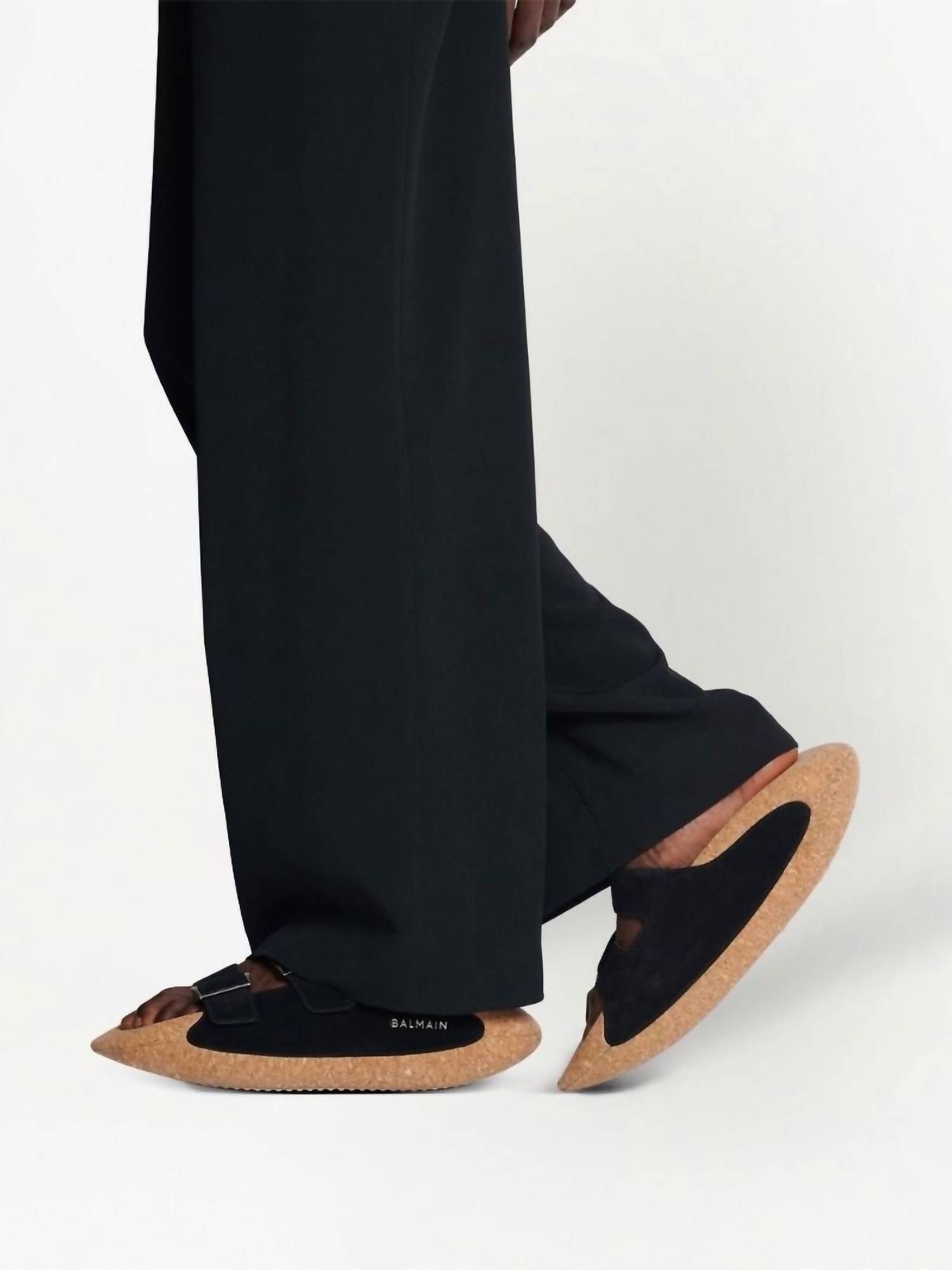 Flowy dresses, cropped pants, and even jumpsuits… this sandal works with them all!Step up your summer style with the Women’s Chunky Sole Flip Flop Sandals by Balmain, offering a contemporary finish to casual design. These chic black sandals feature an open toe and a chunky sole for comfort and trendsetting appeal. Made from 100% Bos Taurus leather on the outer, with a 100% cork lining and sole for a unique texture and feel. Crafted with precision, these sandals are imported and perfect for adding a touch of luxury to your casual ensemble.