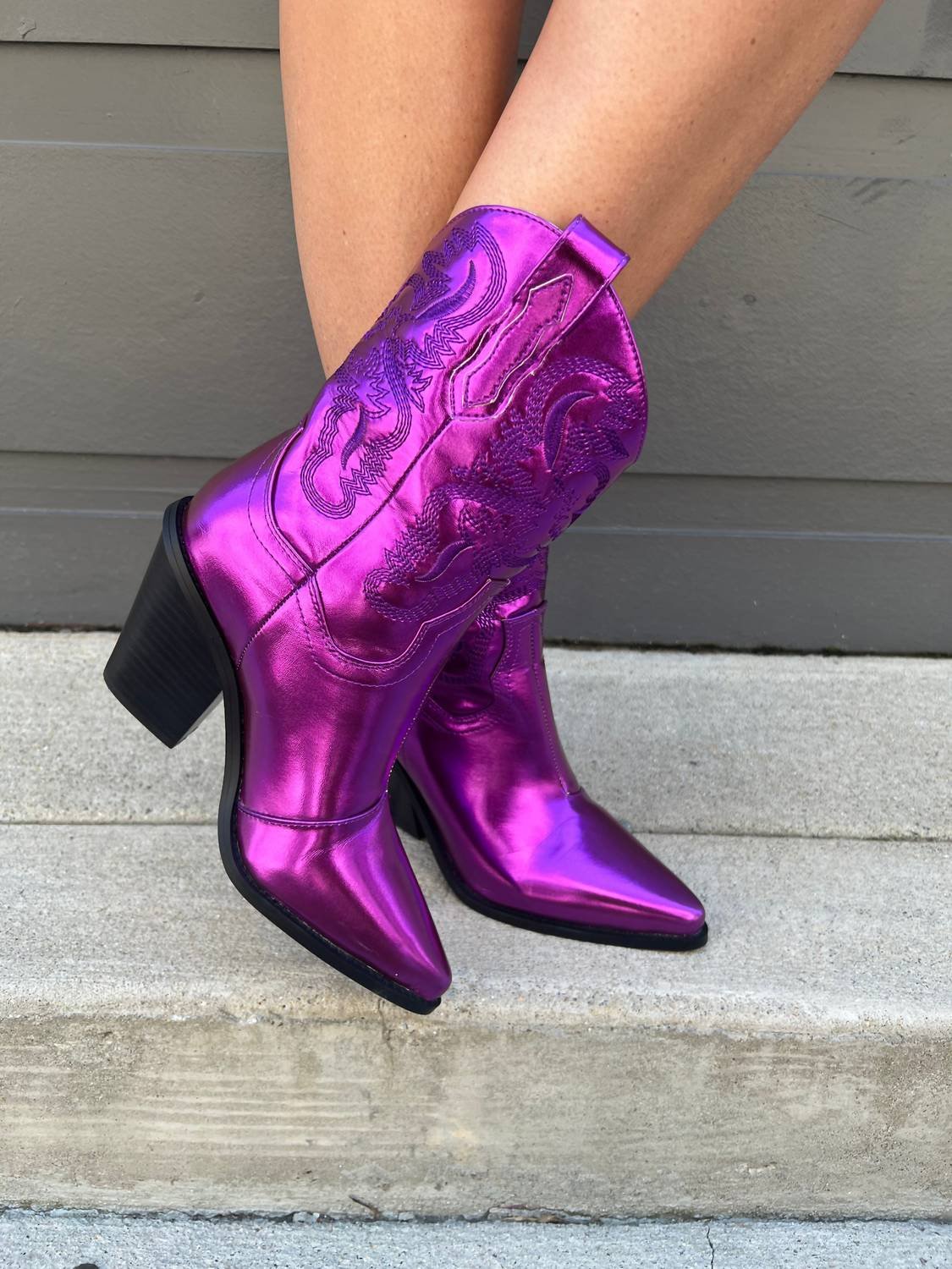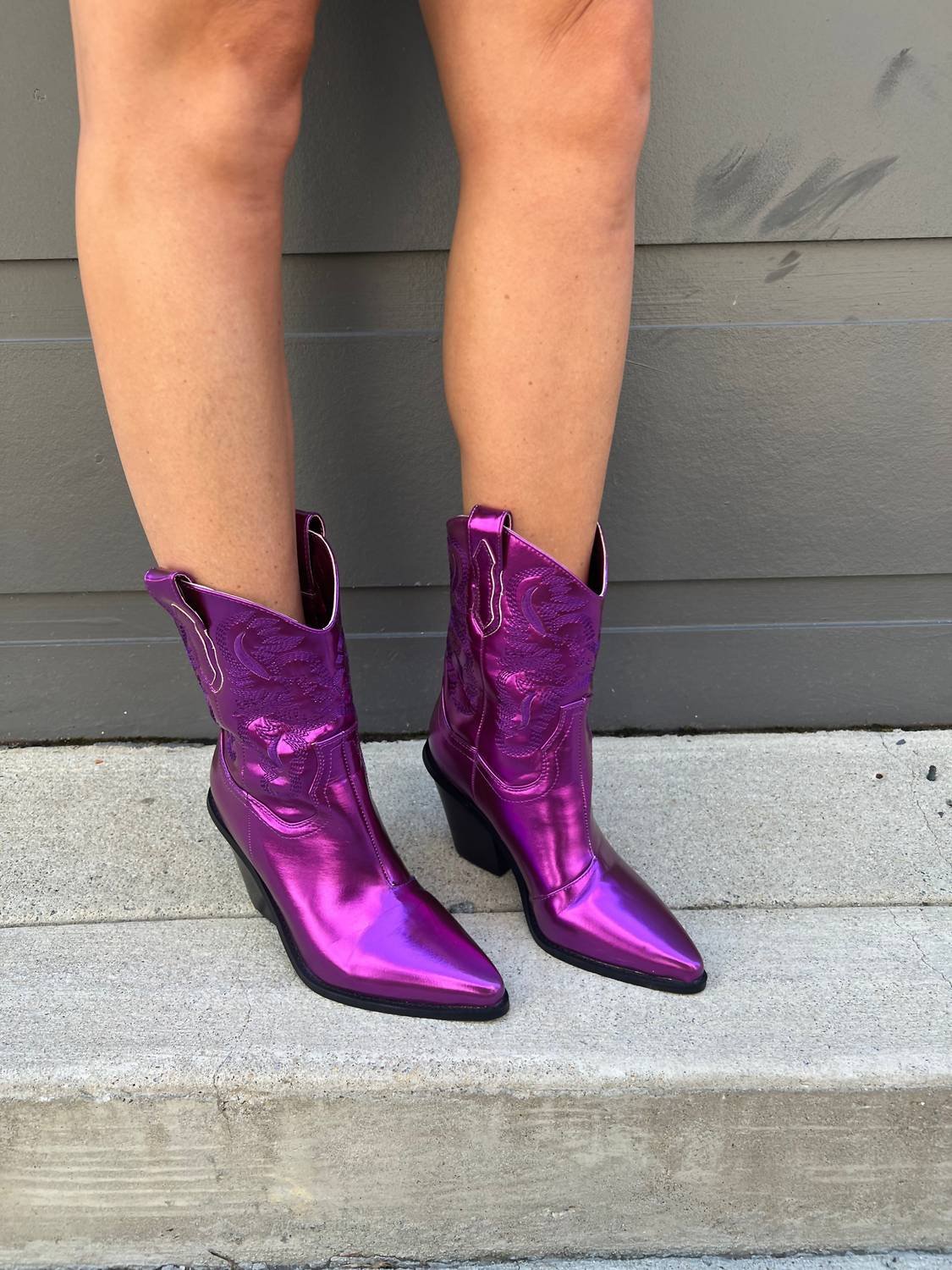 Say hello to the perfect, most versatile boot. The ankle height makes this style easily transition from day to night. Wear them with your favorite skinny jeans and tee for a more laid back look, or pair them with your favorite mini dress and jacket for a night out on the town.Introducing the Reign Boots by BiLLiNi, a stunning pair designed to step up your style game. With a pointed toe and block heel, these metallic calf-length boots in a captivating purple hue add a funky, shimmery touch to any outfit. Perfect for costume parties or a trendy Western look, these boots are a Spring wardrobe must-have. Designed for women, they’re set to make a royal statement.
