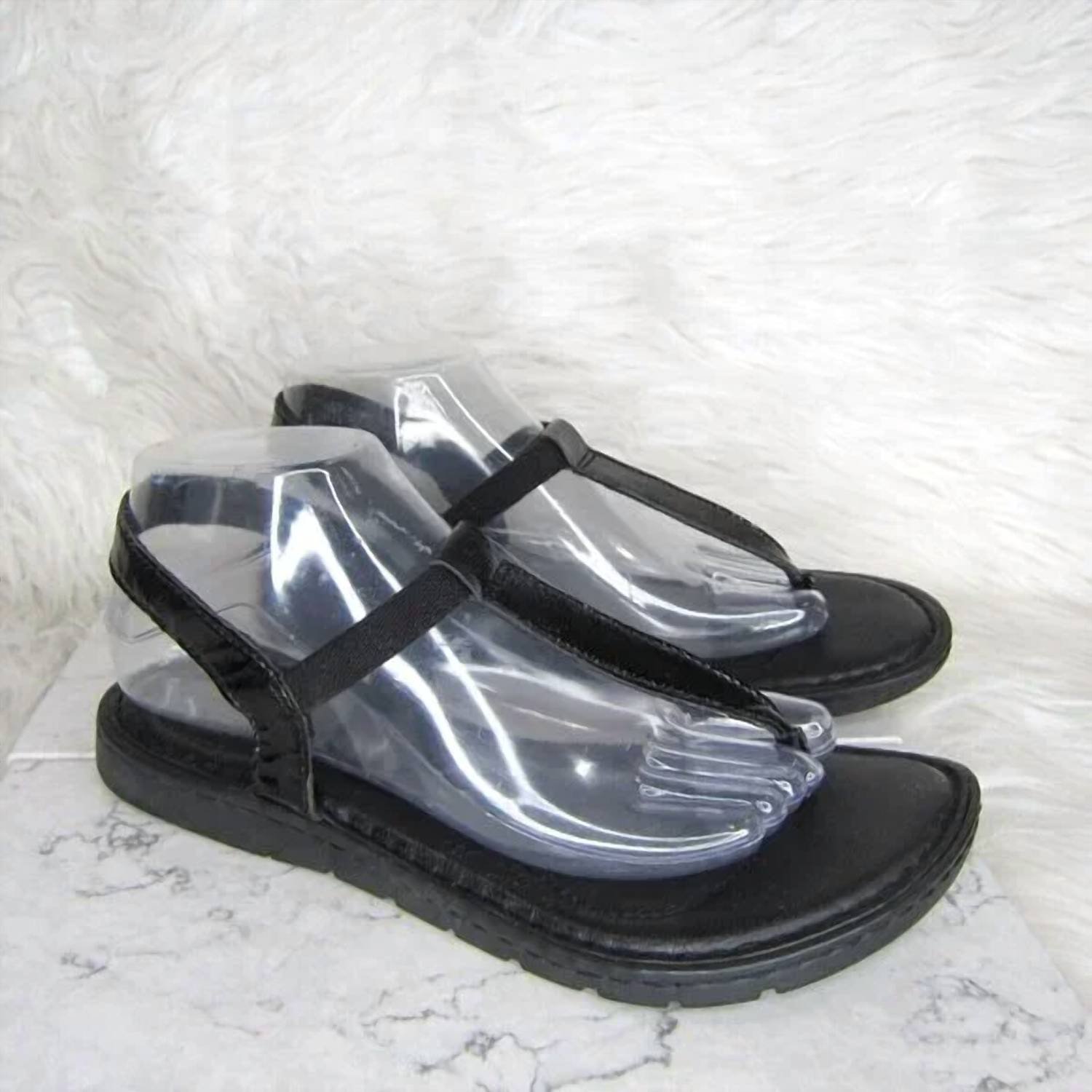 Classicly cute and all-day-wearable. We love this sandal.Step into summer with the Women’s Trinity Sandal by Born, showcasing a sleek leather upper and open toe design in classic black. These sandals feature a genuine breathable leather lining and a cushioned leather footbed complete with added arch support foam for optimal comfort. Lightweight and flexible, the rubber outsole ensures ease of movement, while the Opanka hand-crafted construction promises durability and style. Heel Height: 0.75 inches, Flat Heel, perfect for the summer season.