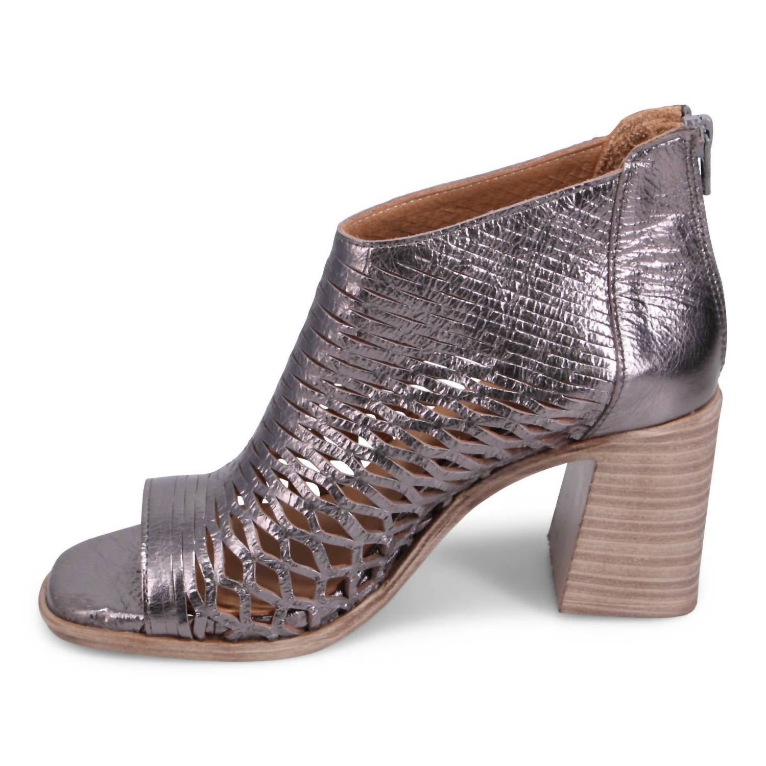 Classicly cute and all-day-wearable. We love this sandal.Introducing the Joey Heeled Sandal by Bueno, the ultimate statement piece for any wardrobe in a dazzling pewter shade. Made with a laser-cut leather upper and a leather lining and footbed, this sandal ensures both elegance and comfort. Featuring a mid block heel at 3′ high and an open toe design, this sandal perfectly complements your favorite pedicure. Ideal for women, the flexible sole makes it as practical as it is stylish.