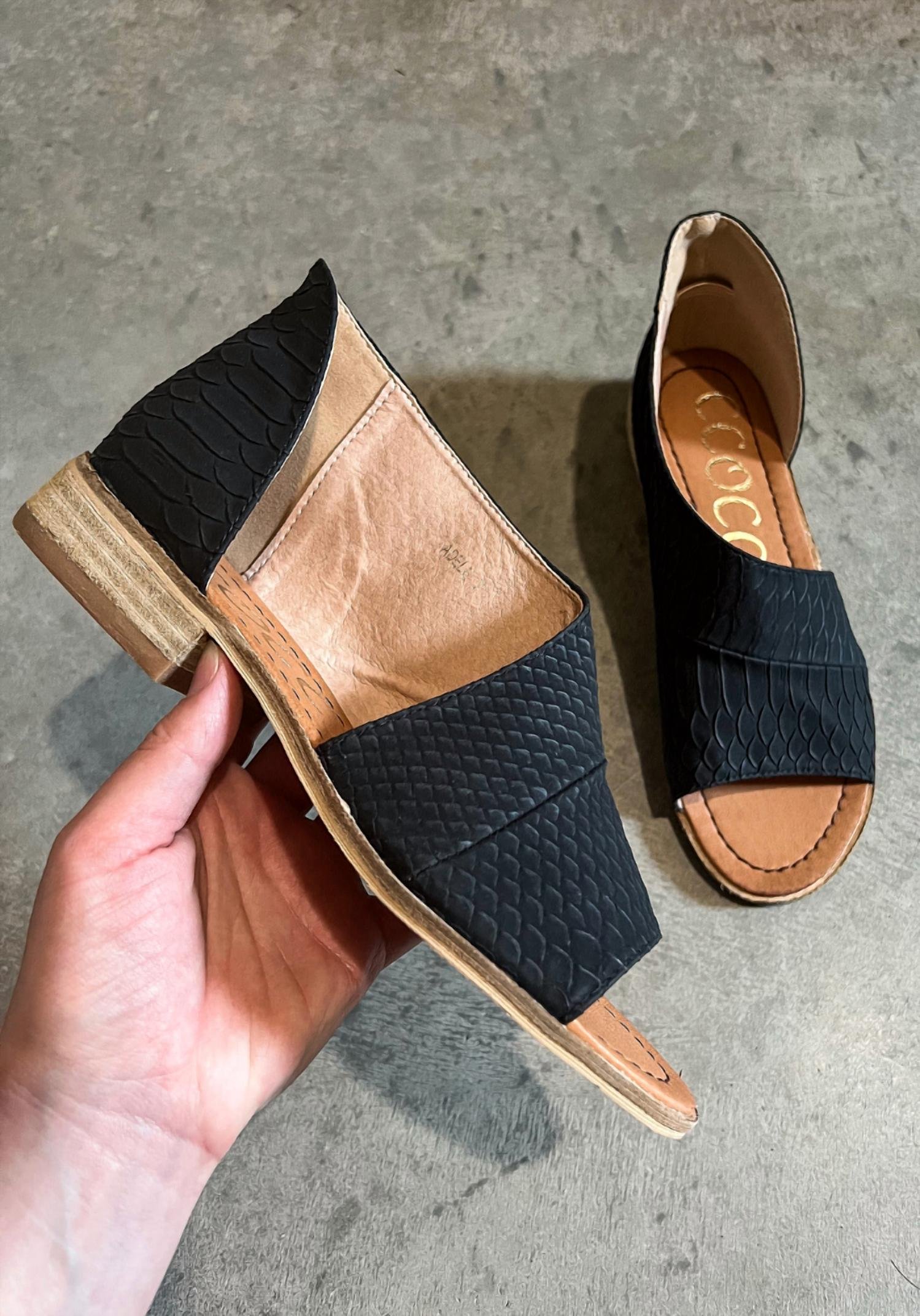 A classic loafer that is both comfortable and polished.Walk through your day wearing our open toe and side cut-out flats! These have a black snake print texture and a 1′ heel.Fit: True to size.
