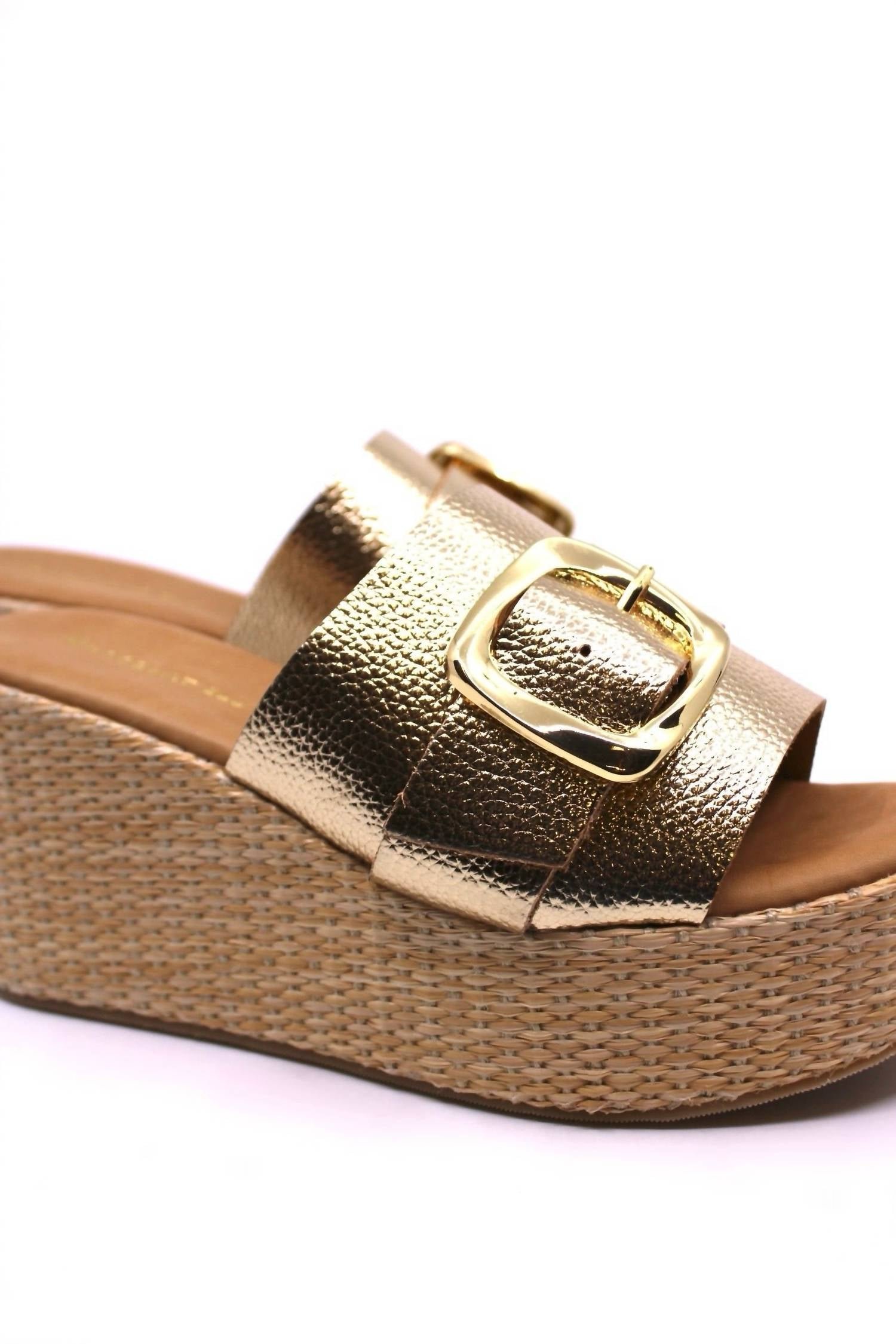 Classicly cute and all-day-wearable. We love this sandal.Step into summer elegance with the Women’s Jana Gold Sandal by CHOCOLAT BLU, the epitome of boho chic charm. These sandals feature a luxurious leather upper and lining, with an alluring open toe design and a decorative buckle. Originating from Italy, they boast a 3 1/4′ heel coupled with a 1 5/8′ platform, perfect for vacation occasions. Experience all-day comfort thanks to the padded footbed and durable rubber outsole.