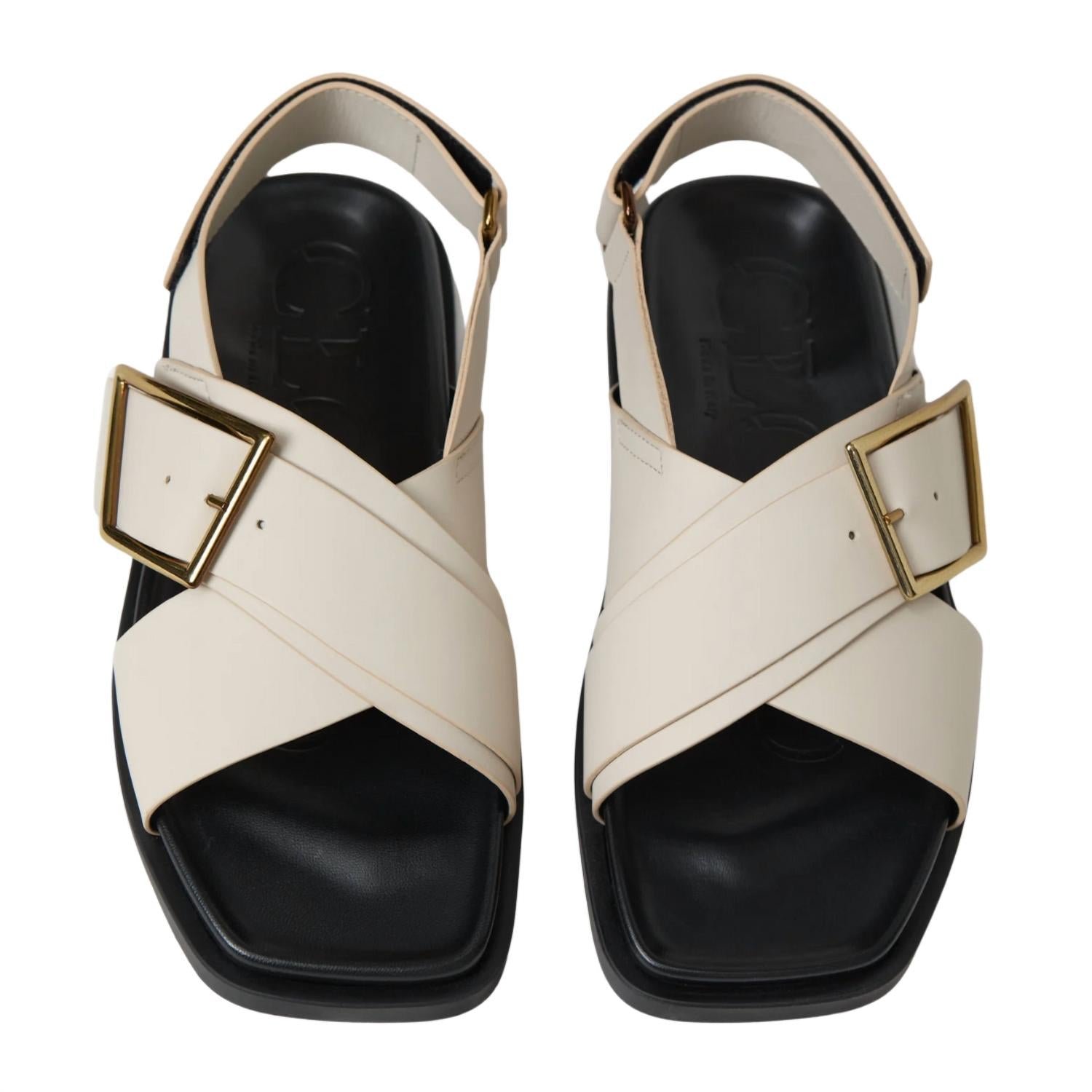 Classicly cute and all-day-wearable. We love this sandal.ClosedLeather SandalsItalian Cowhide Leather in Light GreyCriss-cross leather strapsAsymmetrical gold-tone detail buckleHeel strap with Velcro fasteningLogo embossment footbedRaised tread soleSoft leather liningSize 38= US 8True to sizeMade in Italy
