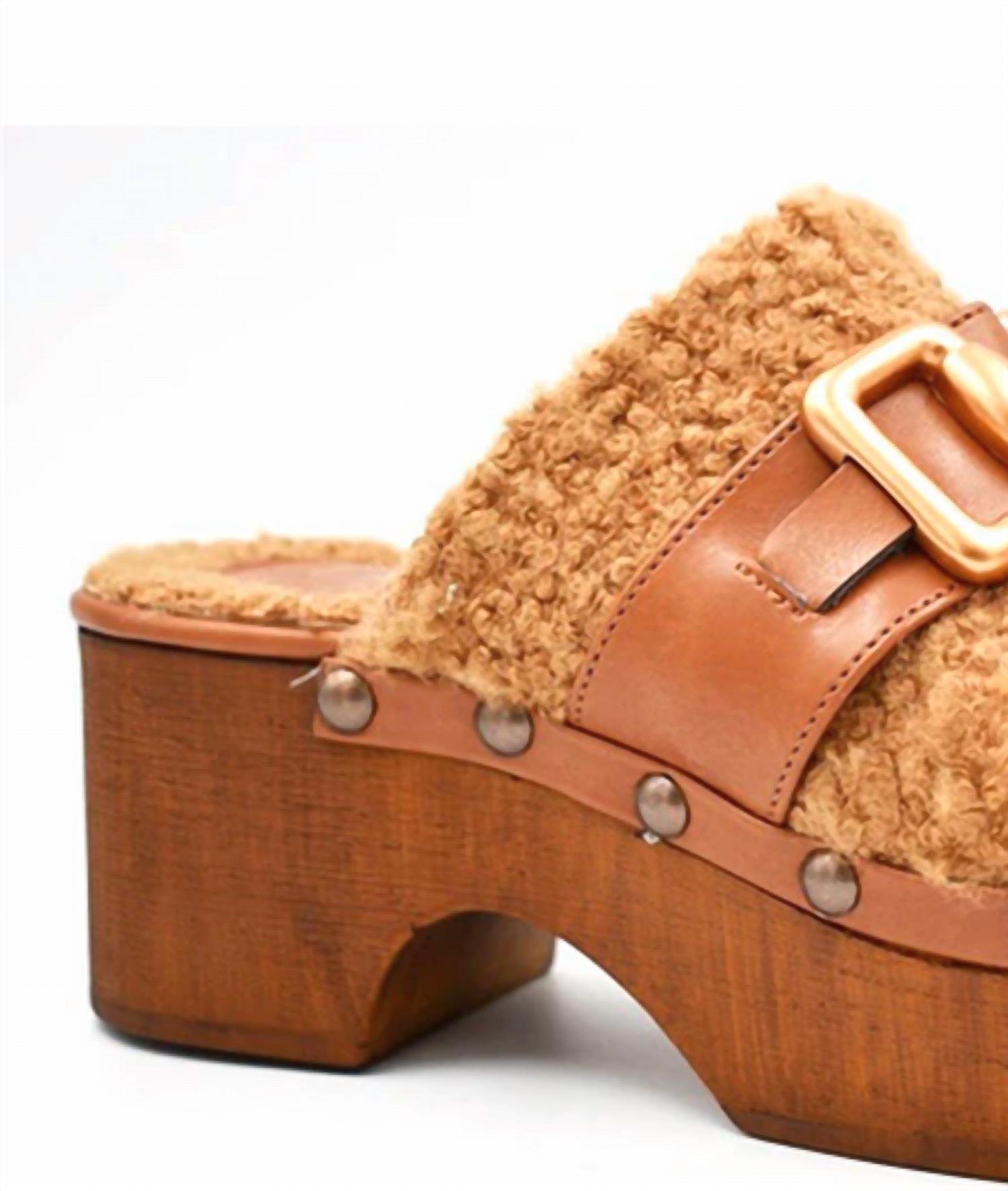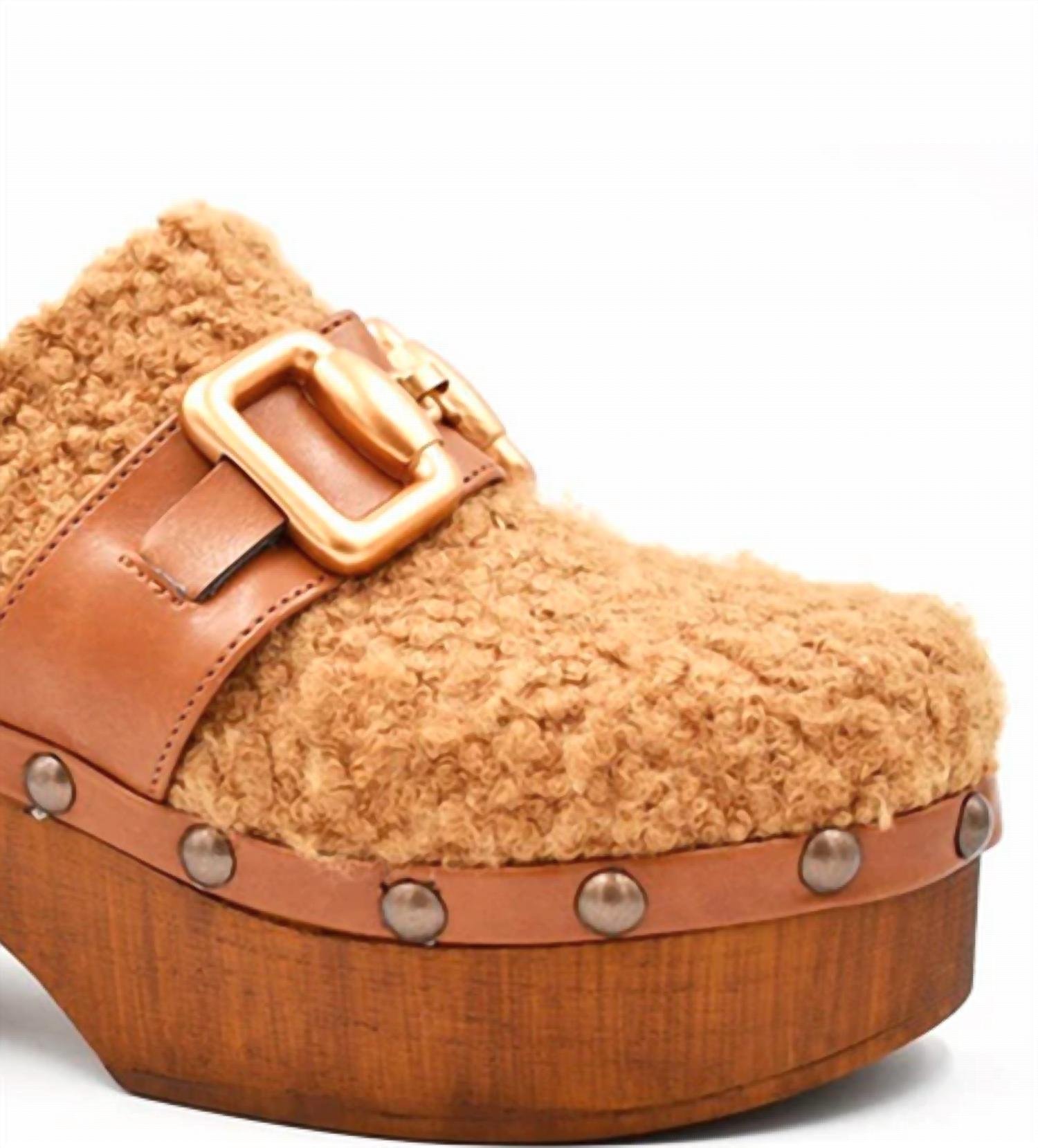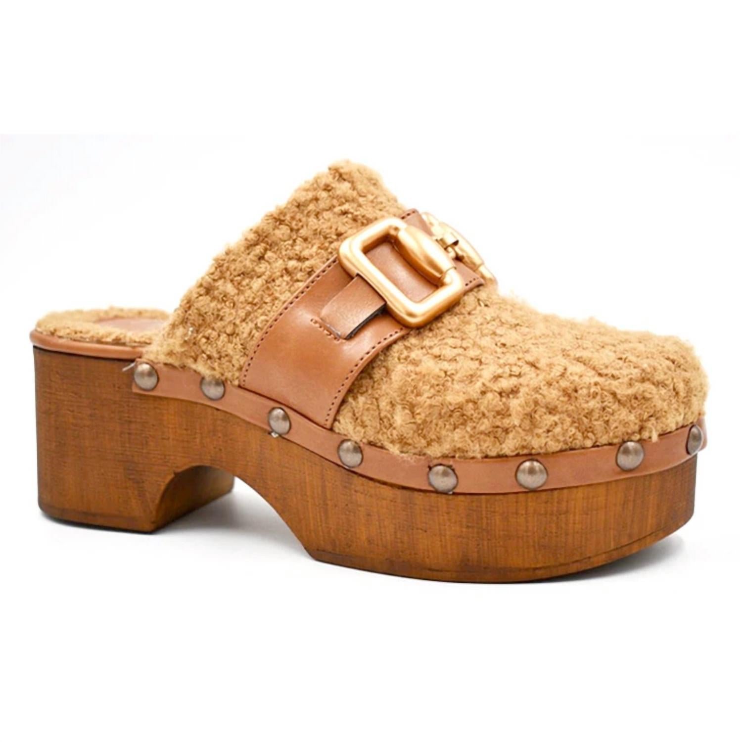 Step into sophisticated style with the Women’s Winona Bit Clogs by CORDANI, perfect for a minimalist holiday party look. These cuoio-colored clogs feature a faux shearling upper with a matching buckle and stud detail on a wood-like platform heel. Made in Italy, they boast a lightly padded footbed, leather lining, and a rubber sole for comfort and durability. With a heel height of 2.75 inches and a platform height of 1.75 inches, they offer a chic lift while ensuring all-day comfort.