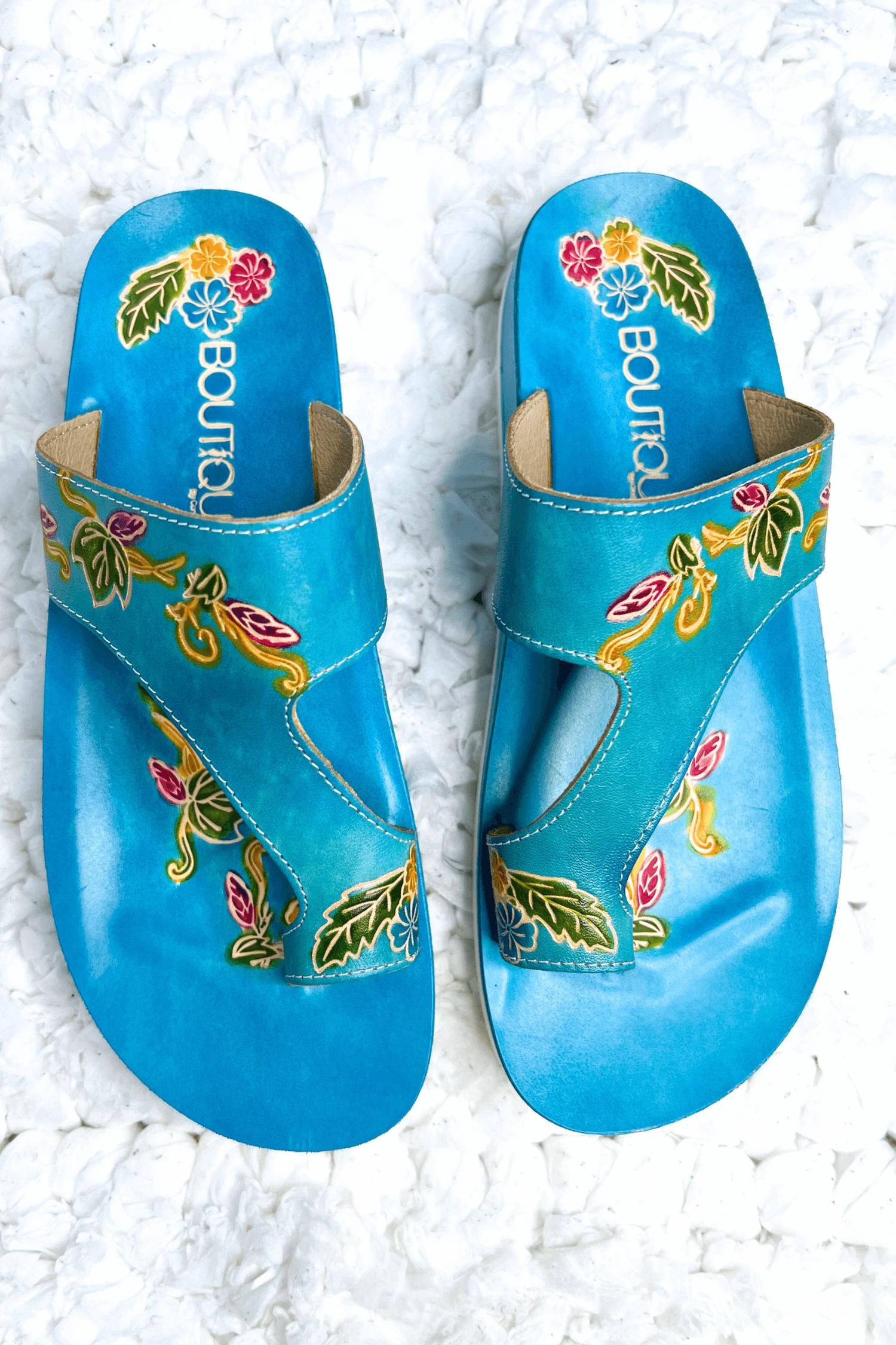 Classicly cute and all-day-wearable. We love this sandal.These stunning sandals feature a gorgeous turquoise color and floral embroidered designs throughout. Cushioned footbed ensures all-day comfort. The textured sole provides excellent grip and stability. The leather upper is durable and easy to maintain.
