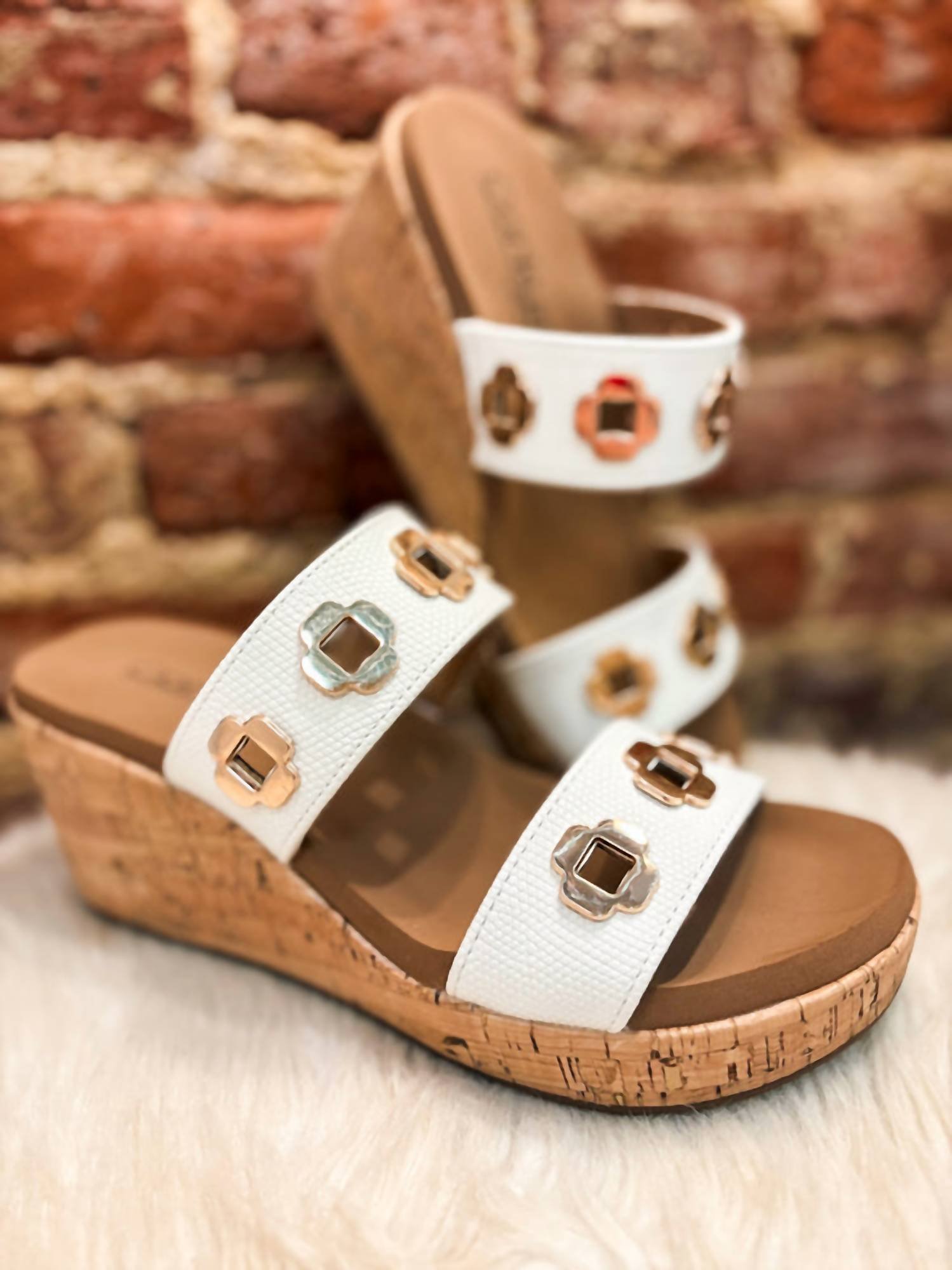 This sandal will take you from brunch to dinner and everything in between.Step into summer sophistication with the Women’s Hi Tide Wedge Sandals by Corkys Footwear in a striking White and Gold. These sandals boast a 3-inch wedge heel for added height and comfort, featuring open toe design and metal-accented straps that offer a chic, edgy flair. Ideal for both casual and dressy events, they effortlessly pair with a variety of outfits, making them perfect for dinner parties or Mother’s Day celebrations. Easy slip-on style ensures convenience for your on-the-go lifestyle.