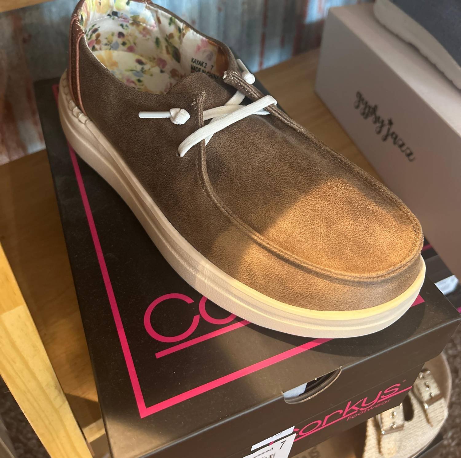 A classic loafer that is both comfortable and polished.Experience the effortless comfort and style with the Women’s Kayak 2 Slip-on Shoes by Corkys Footwear. These flats are crafted from faux leather in a distressed tan, complemented by a tan rubber sole and a cognac heel. Designed with a squared toe and flat heel, they are perfect for spring vacations or preppy holiday occasions. Ideal for women seeking medium width shoes, these slip-ons ensure all-day wearability with their cushioned insole.