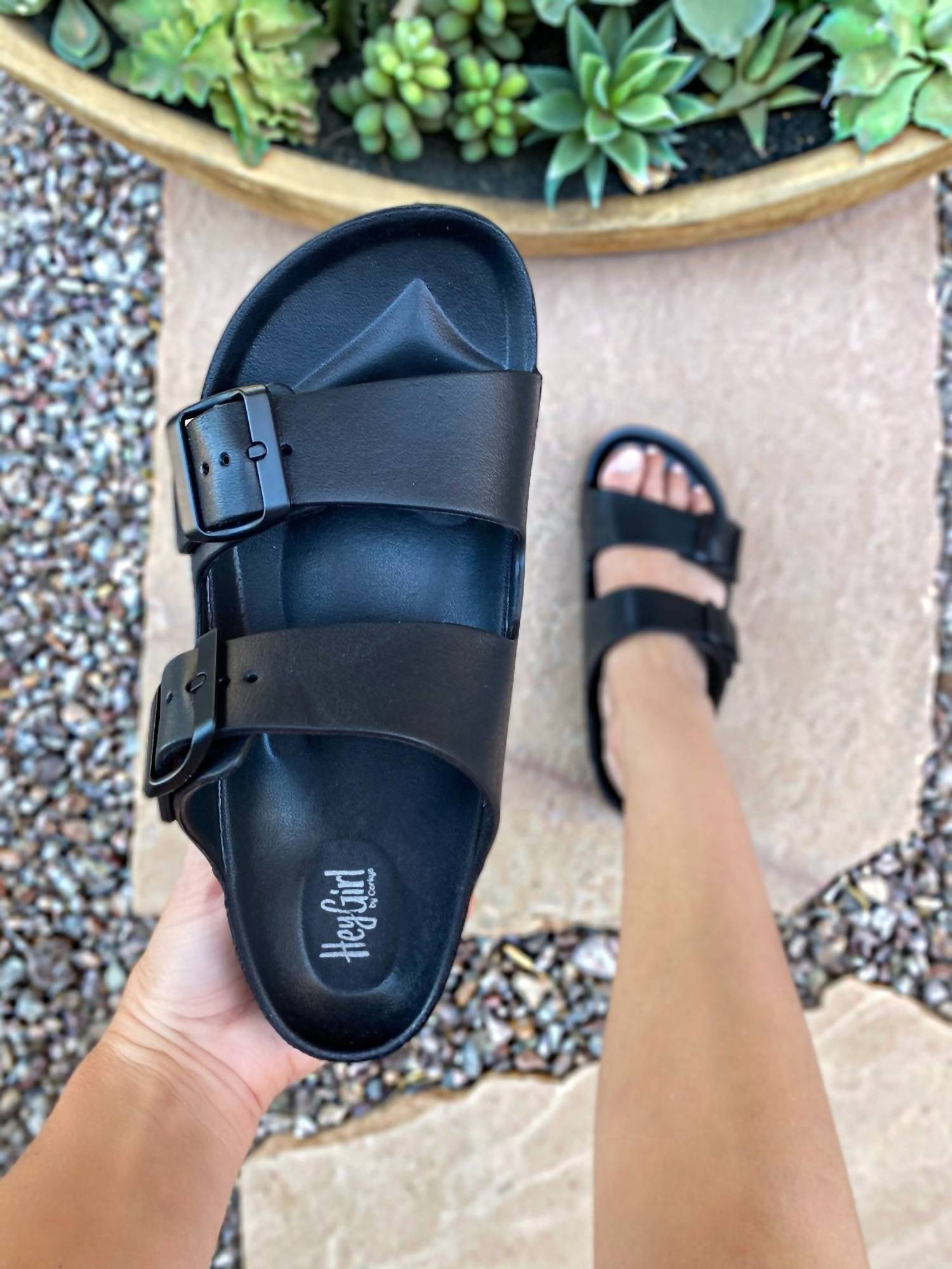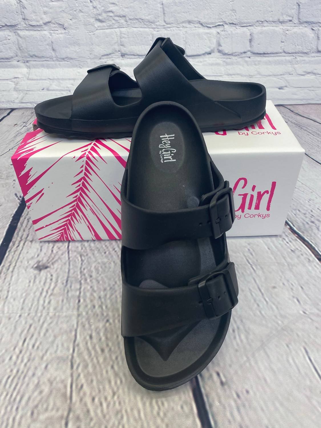 Flowy dresses, cropped pants, and even jumpsuits… this sandal works with them all!Dive into summer style with the Women’s Waterslide Sandals by Corkys Footwear, a must-have in black for any beach or pool outing. With an open toe design, these slides feature a flat platform heel and lightweight, waterproof EVA rubber composition. Adjustable double straps ensure a perfect fit, making them ideal for a day by the water or casual strolls around town. These slip-on sandals fit true to size, embodying a minimalist trend for warm-weather occasions.