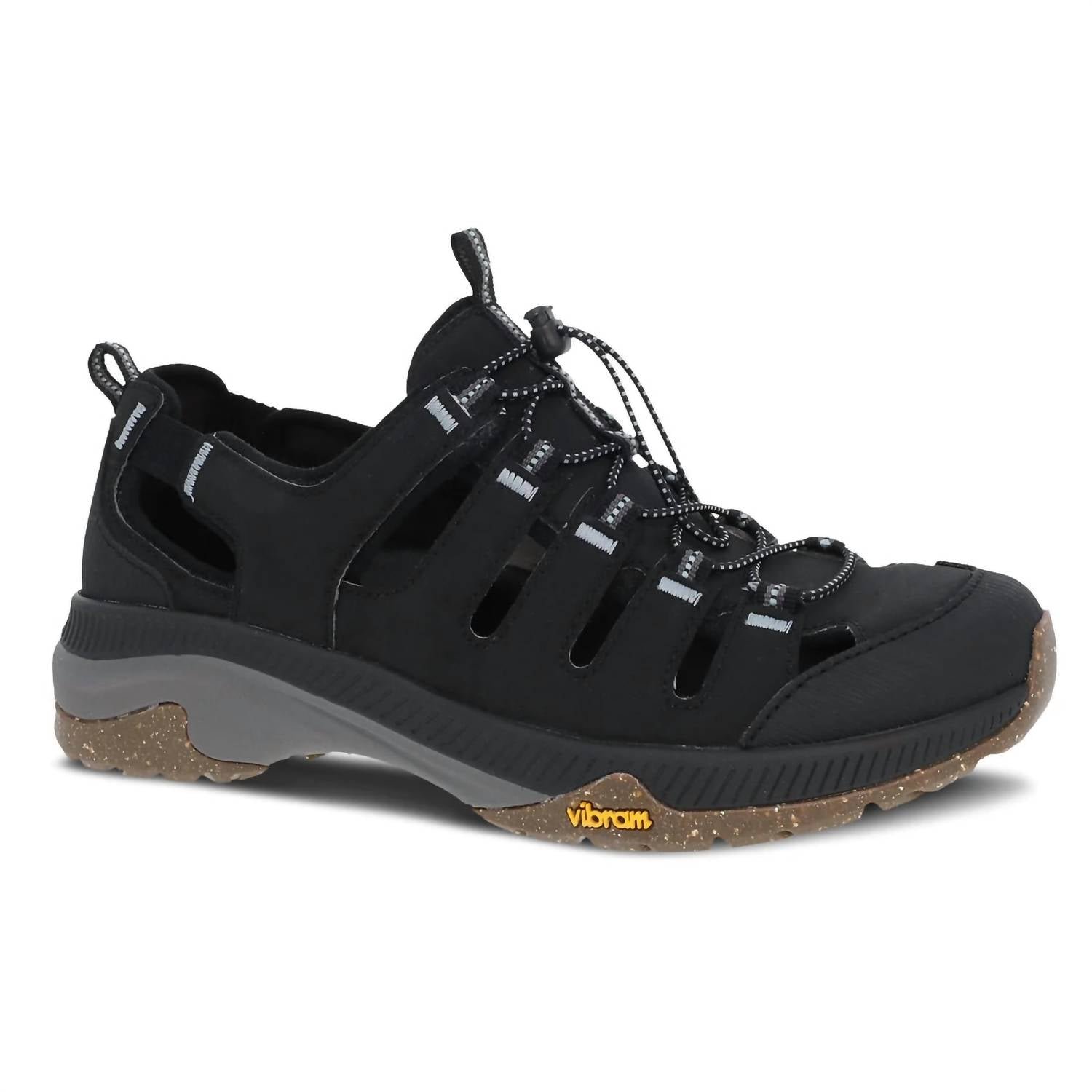 This sandal will take you from brunch to dinner and everything in between.Discover the Women’s Mia Shoes by Dansko, a lightweight and durable option perfect for urban exploration or tackling nature trails. These black sandals feature a flat heel and a round toe, crafted with an upper made from 100% recycled PET and lined with moisture-managing, odor-controlling recycled textile. The removable EVA footbed with Dansko Natural Arch Plus? technology offers exceptional comfort, supported by a lightweight EVA midsole and a slip-resistant Vibram ECOSTEP EVO rubber outsole. Ideal for hiking, these shoes offer toggle adjustability and accommodate most orthotics, making them a versatile choice for the summer season.