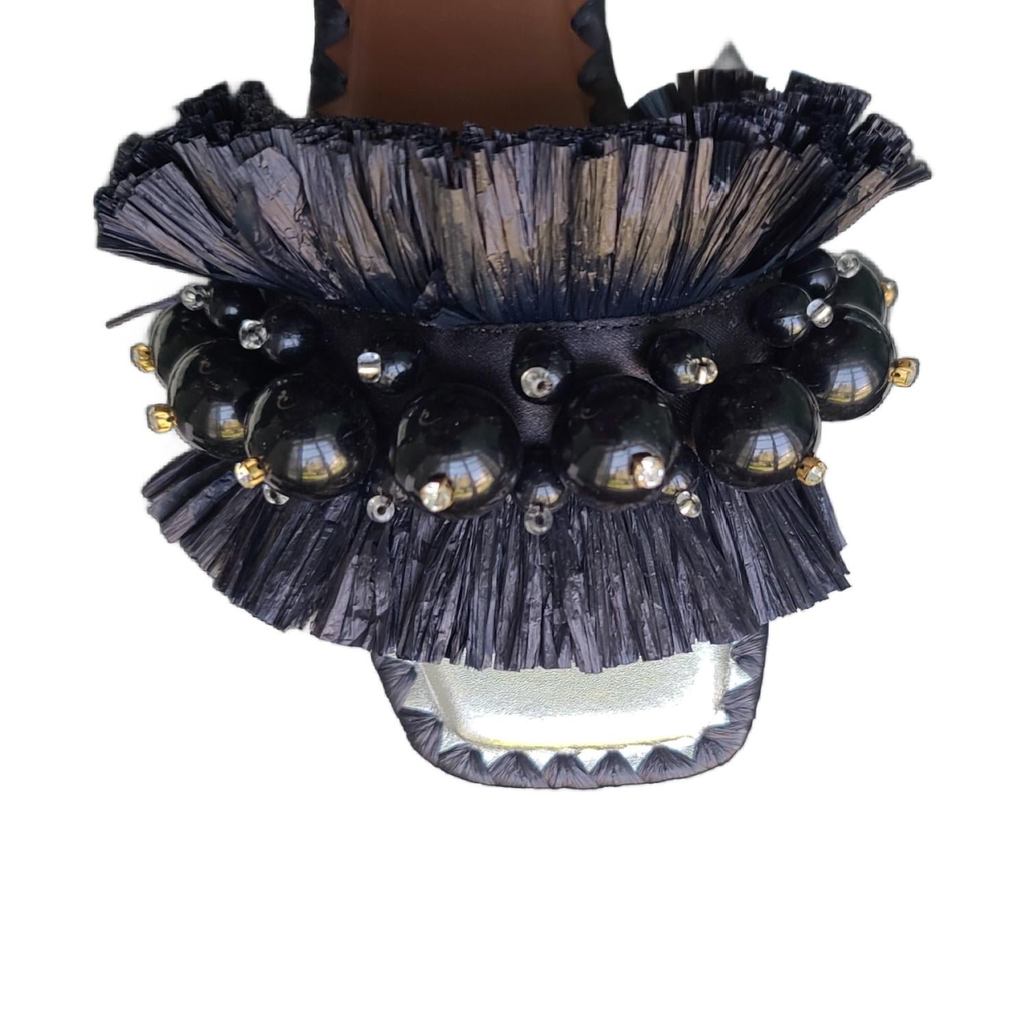 This sandal will take you from brunch to dinner and everything in between.Crafted for sophisticated comfort with a flat heel made from luxurious leather. Featuring hand-stitched black raffia fringes and a soft camel leather insole, these sandals perfectly embody Italian elegance. With an open toe design and a camel leather sole, they ensure style and comfort for any occasion. Ideal for women who appreciate quality craftsmanship with a true-to-size Italian fit.