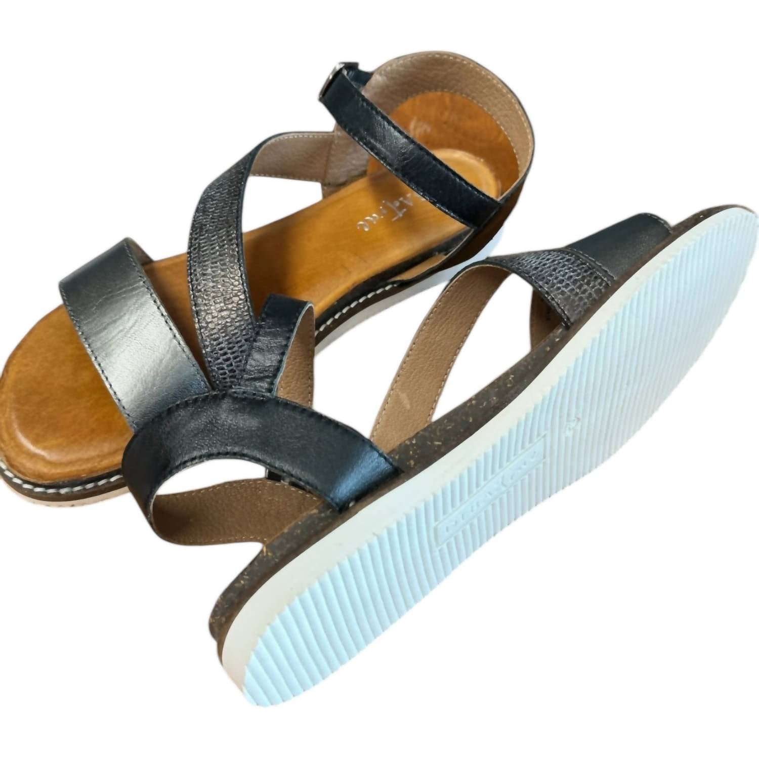 Step into comfort and style. Feature a chic mix of leather materials in a metallic black. Calf hair upper and a supportive leather lining. Ensuring both durability and a fashion-forward look. Include an adjustable ankle strap with a secure buckle closure and a padded insole. 0.5-inch flat heel and medium width provide a balanced, comfortable fit.