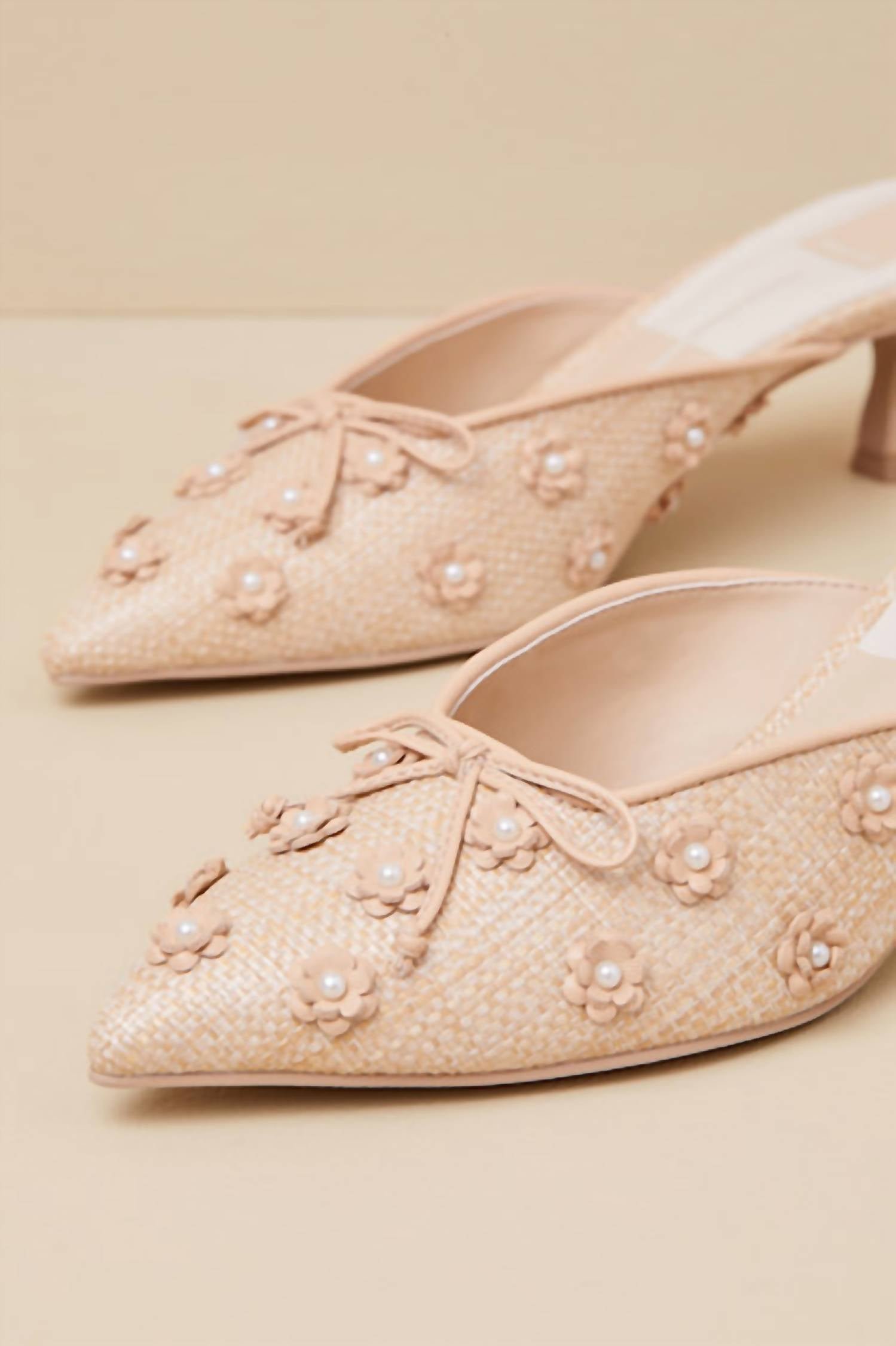 The perfect height for day to night.Step into quiet luxury with the Women’s Camilo Kitten Heel by Dolce Vita, a refined choice for your summer vacation wardrobe. These stylish light natural raffia heels feature a chic pointed toe accented with delicate floral appliques and pearly centers, finished off with a dainty bow. Crafted with genuine leather accents and balanced with man-made materials, the mules boast a trendy 2′ spool heel for a hint of height. Perfectly imported and designed for effortless elegance, they slip on with ease for any warm-weather occasion.