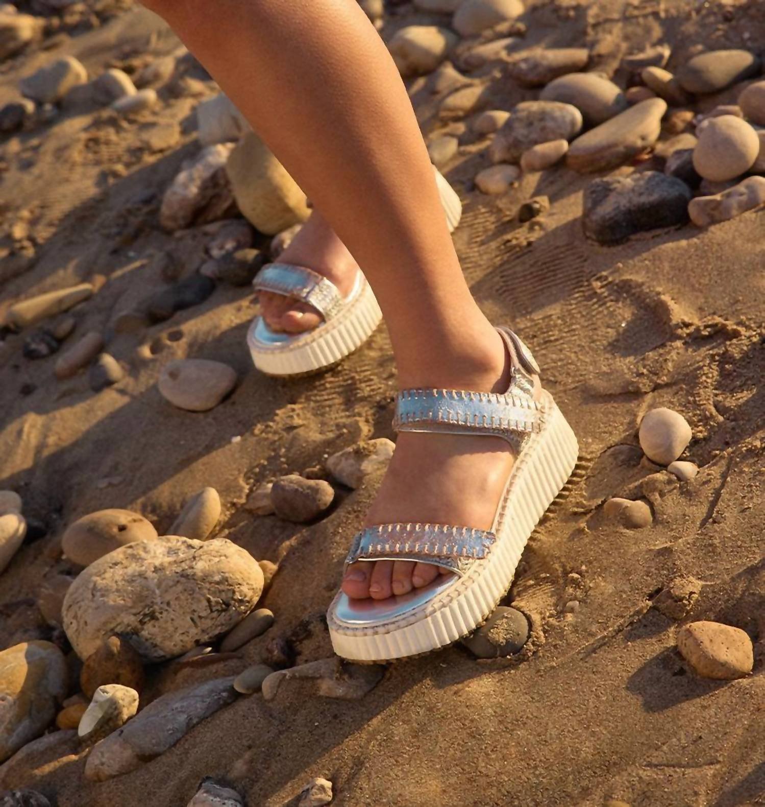 Flowy dresses, cropped pants, and even jumpsuits… this sandal works with them all!Step into effortlessly chic style with the Debra Platform Sandal by Dolce Vita, an ideal choice for your streetwear wardrobe. Featuring a 2.3-inch platform wedge heel, this sandal boasts a sleek silver leather upper and a convenient velcro closure. The synthetic lining and rubber outsole ensure all-day comfort, making it the perfect companion for travel and 4th of July celebrations. Imported and designed with a modern round toe, these sandals are ready to elevate your spring looks.