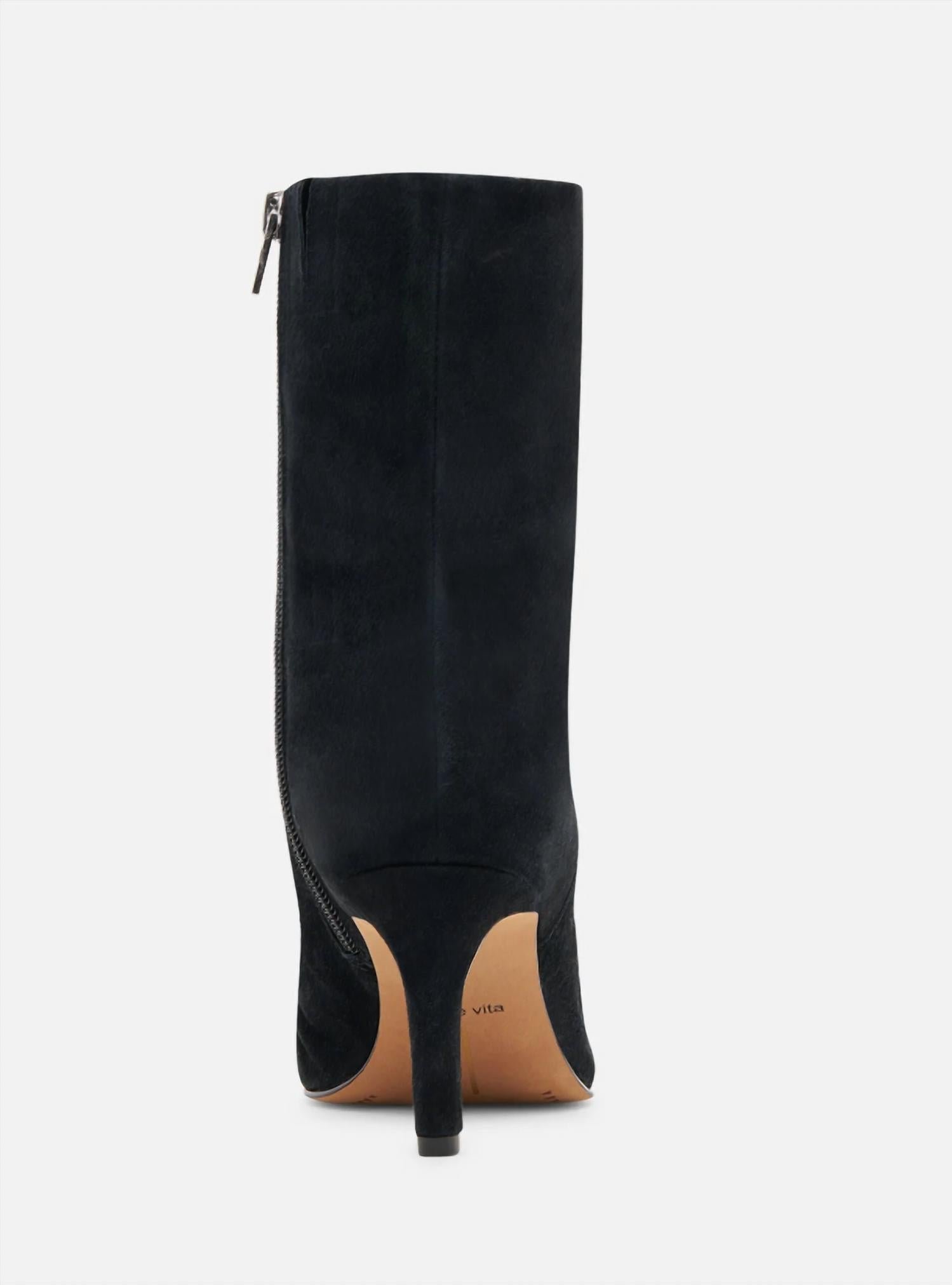 Step out in confidence and showcase your impeccable taste with these fashionable and versatile boots. Their classic style will have you reaching for these boots season after season.Step into luxury with Dolce Vita’s Women’s Fernly Boots, engineered for the maximalist style with an effortless vibe. Designed with a chic mid-calf silhouette, these heeled boots boast a 7.9′ shaft height and a 10.8′ leg circumference, complete with a striking 2.8′ stiletto heel. Crafted from suede uppers, these boots are lined with recycled microsuede and leather, with a recycled synthetic outsole and a water-based leather alternative sock for sustainable elegance. Perfect for a New Year’s Eve dinner party, enjoy the sleek look in rich suede tones or make a statement in silver metallic.