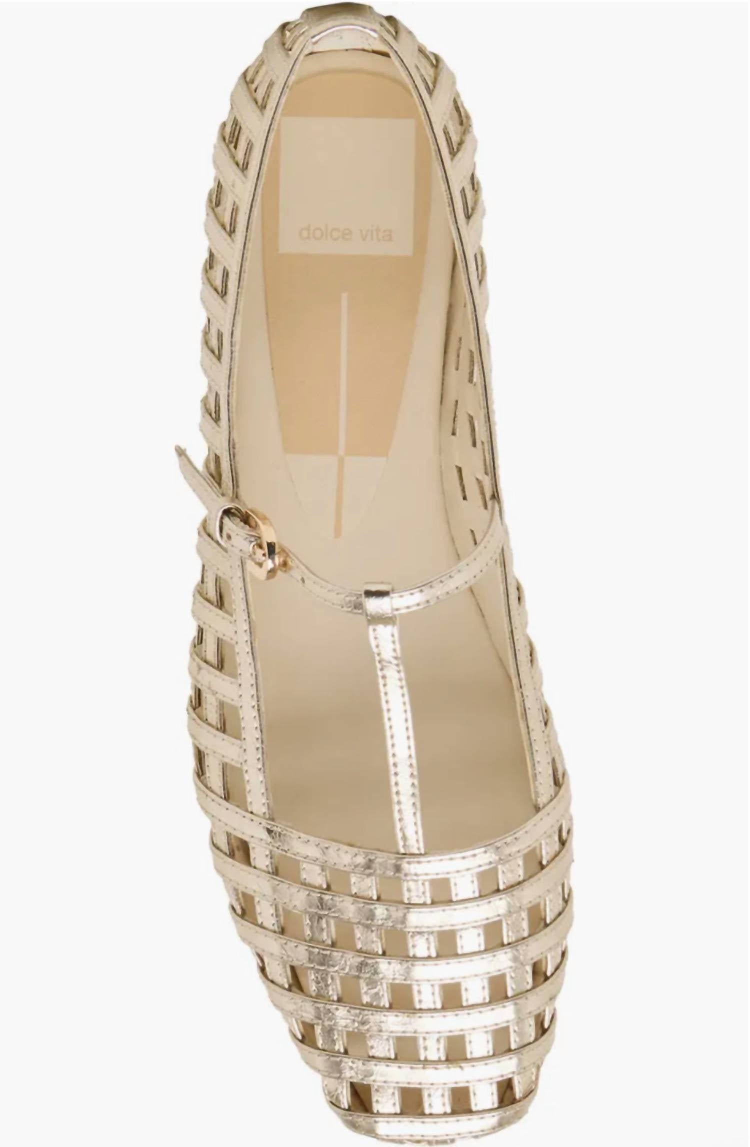 A preppy yet feminine take on the classic loafer.Introducing the Women’s Rains Ballet Flat by Dolce Vita, an elegant choice for minimalist style in Light Gold Stella. This everyday flat features a breezy woven upper with a T-strap silhouette, complemented by a round toe and flat heel. Closure: Adjustable strap with buckle. Made from synthetic materials, ensuring durability and style.