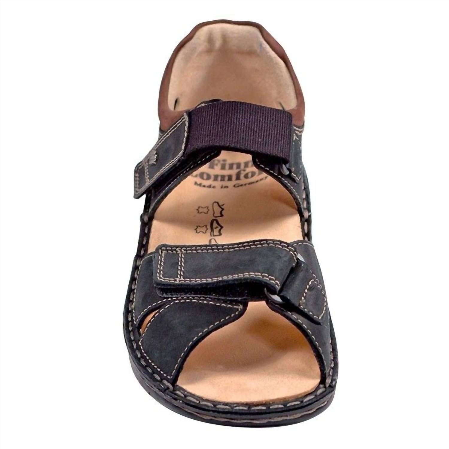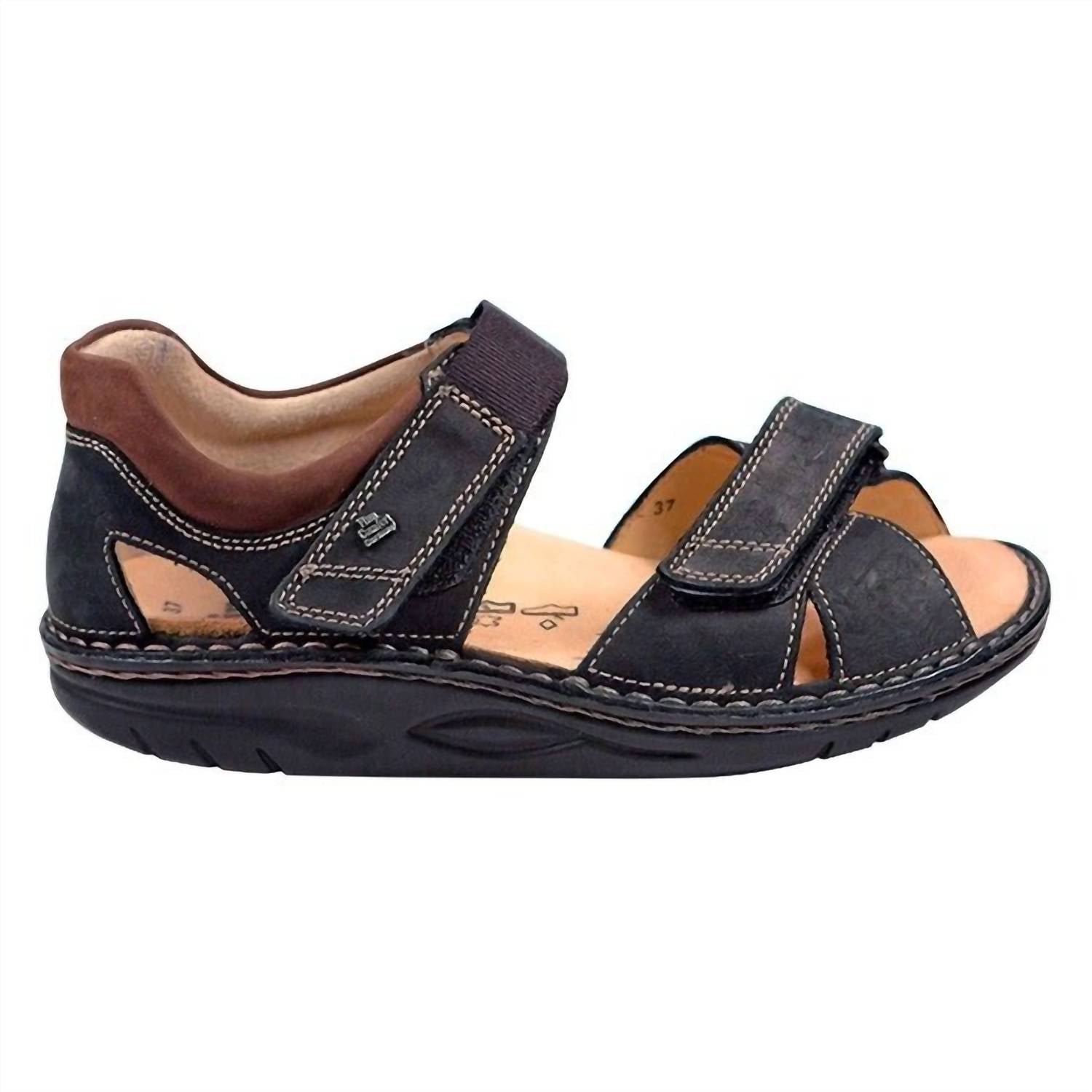 This sandal will take you from brunch to dinner and everything in between.Step into comfort with the Women’s Samara Sandal by Finn Comfort, expertly crafted in black rich leather. This sandal features an open toe and flat heel style, complete with adjustable hook-and-loop straps for a personalized fit. Made in Germany, it boasts a feather-light polyurethane outsole and a removable cork and latex insole for flexibility and support. Enjoy a smooth heel-to-toe motion with its unique Finnamic? construction and maintain foot health with its moisture-absorbing suede insole lining. Weight: 9 oz, Platform Height: 1/2 in.