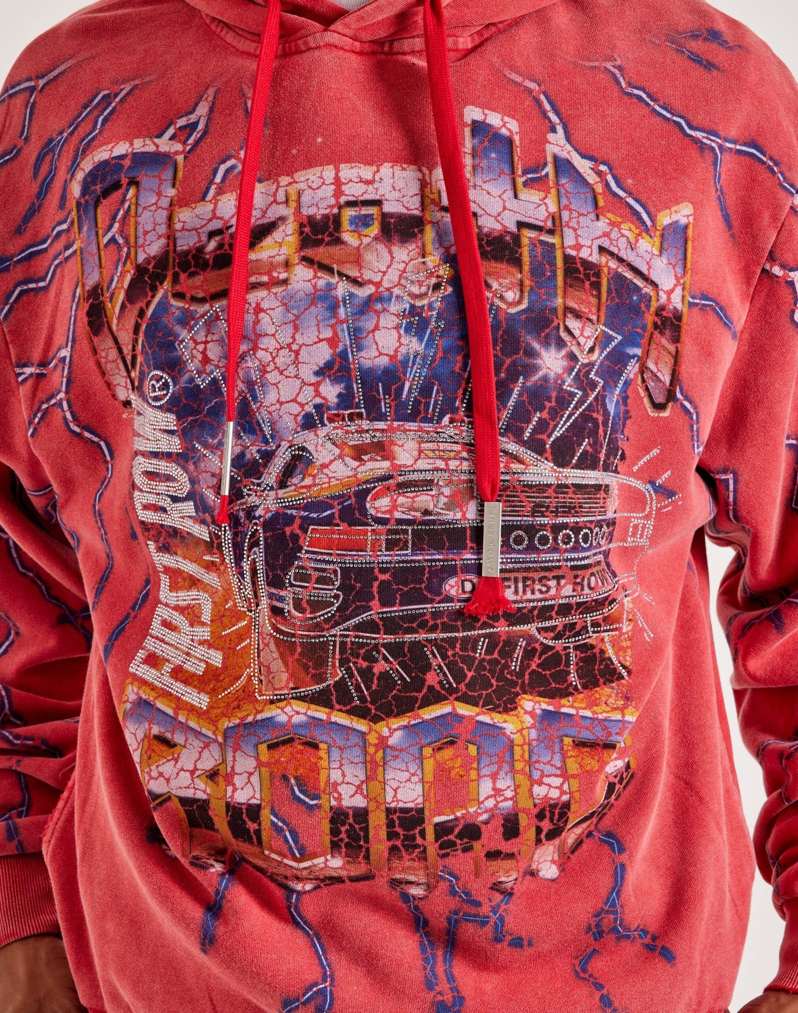 Bundle up and show out in the Death Road Hoodie from First Row. Crafted from soft cotton, this men’s sweatshirt displays bold, rhinestone-studded graphics on the front, back, and sleeves.