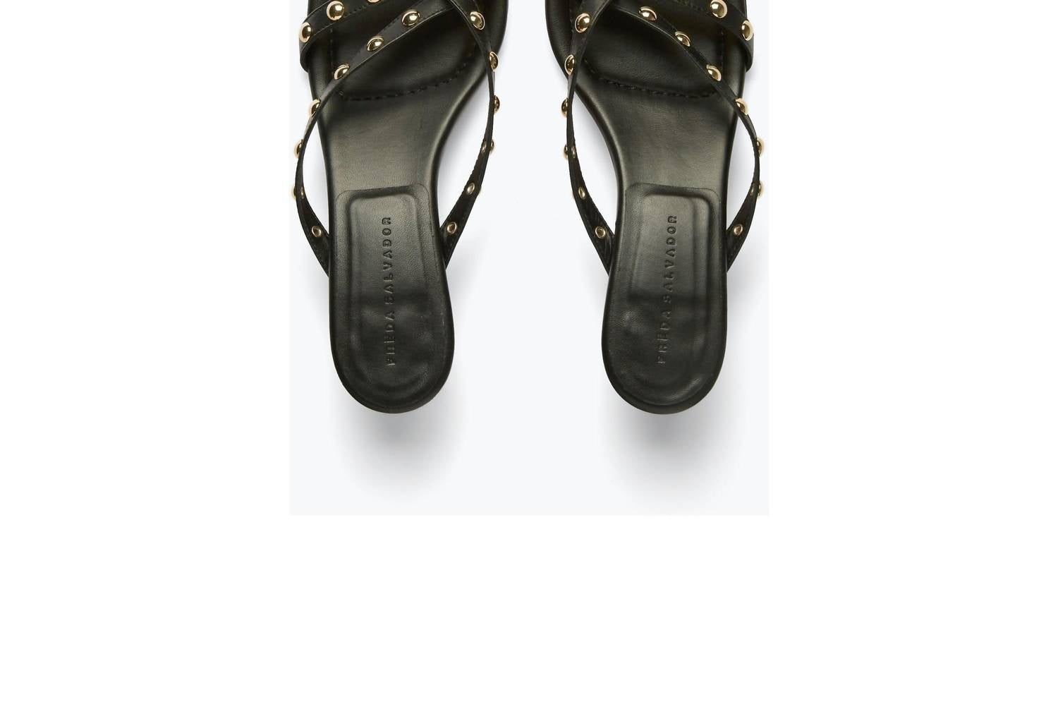 Classicly cute and all-day-wearable. We love this sandal.Step into understated elegance with the Women’s Elaine Heel Sandals by FREDA SALVADOR, a striking blend of cool, refined 90s fashion and modern day craftsmanship. Featuring clean crisscross lines and a squared toe, these sandals are handmade in Spain using 100% Italian leather in black nappa with gold-plated studs, each a testament to the Leather Working Group’s environmental standards. The 1.75′ leather-wrapped heel and sueded leather sole add a touch of luxury, while the padded leather footbed ensures comfort. Perfect for anniversaries or Mother’s Day, embrace quiet luxury with a silhouette designed to impress.
