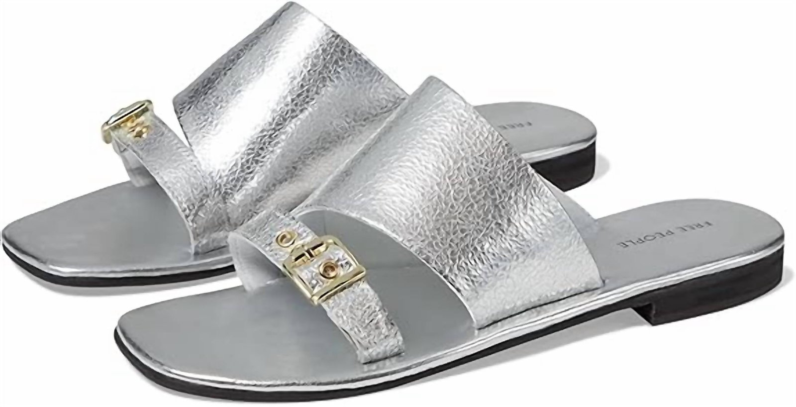 Classicly cute and all-day-wearable. We love this sandal.Step into sophistication with the Women’s Mila Sandals by Free People, ideal for your holiday party ensemble. These streamlined silver slides feature an eye-catching decorative buckle strap and are crafted from luxurious leather for the upper, lining, and sole. Designed with a minimalist open toe and flat heel, they seamlessly blend style with comfort. Perfect for summer outings, these sandals are a must-have for the Thanksgiving season.