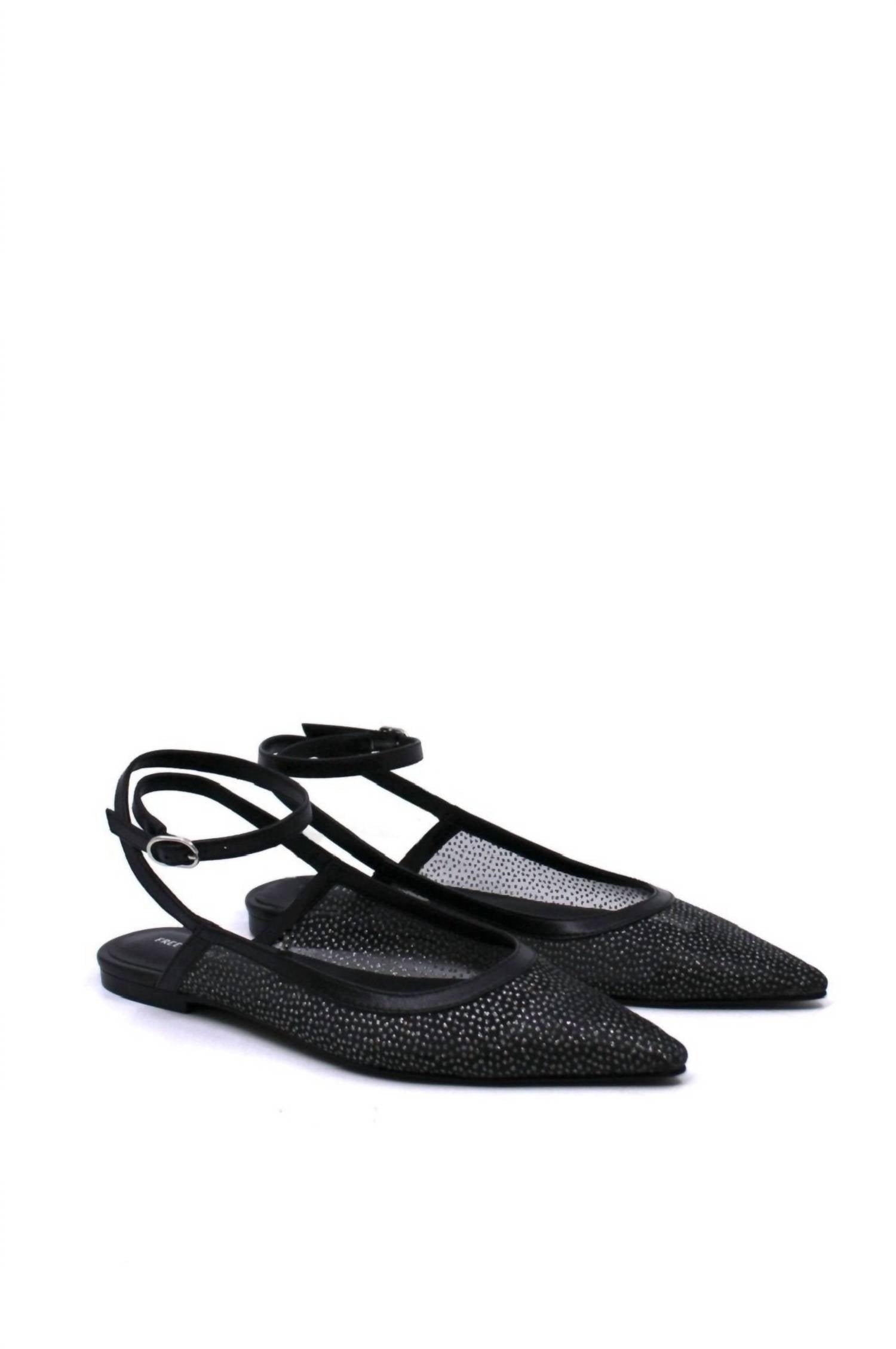 These ballet flats feature glittering sheer mesh with a solid pointed toe and an adjustable buckle ankle strap. They have a flat sole. Imported.