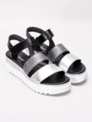 Flowy dresses, cropped pants, and even jumpsuits… this sandal works with them all!Step into sophistication with the Women’s Platform Sling Sandal by GABOR, combining elegance and ease in black and silver. Featuring adjustable velcro ankle straps, these sandals are crafted from leather, promising style and durability. The design includes an open toe and a striking mid-platform heel, with heights of approximately 2.16 inches for the heel and 1.37 inches for the platform, ensuring comfort and a sleek silhouette. The synthetic outsole exhibits a wavy pattern, while the black lining and seamless logo detail add a touch of understated luxury.