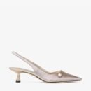 This sandal will take you from brunch to dinner and everything in between.Step into elegance with the Women’s Wonderful Glitter Slingback Heels by JIMMY CHOO, the perfect companion for a glamorous night out. Crafted from a sparkling glitter fabric upper, these silver sandals feature a pointed toe, a pearl-adorned strap with the iconic logo, and an elasticated slingback for a chic slip-on style. Enhanced by a leather lining and sole, they offer a stylish 45mm (1.8′) kick heel, ideal for a low yet sophisticated lift. These heels embody luxury and grace, making them an impeccable addition to any workwear or holiday party ensemble.