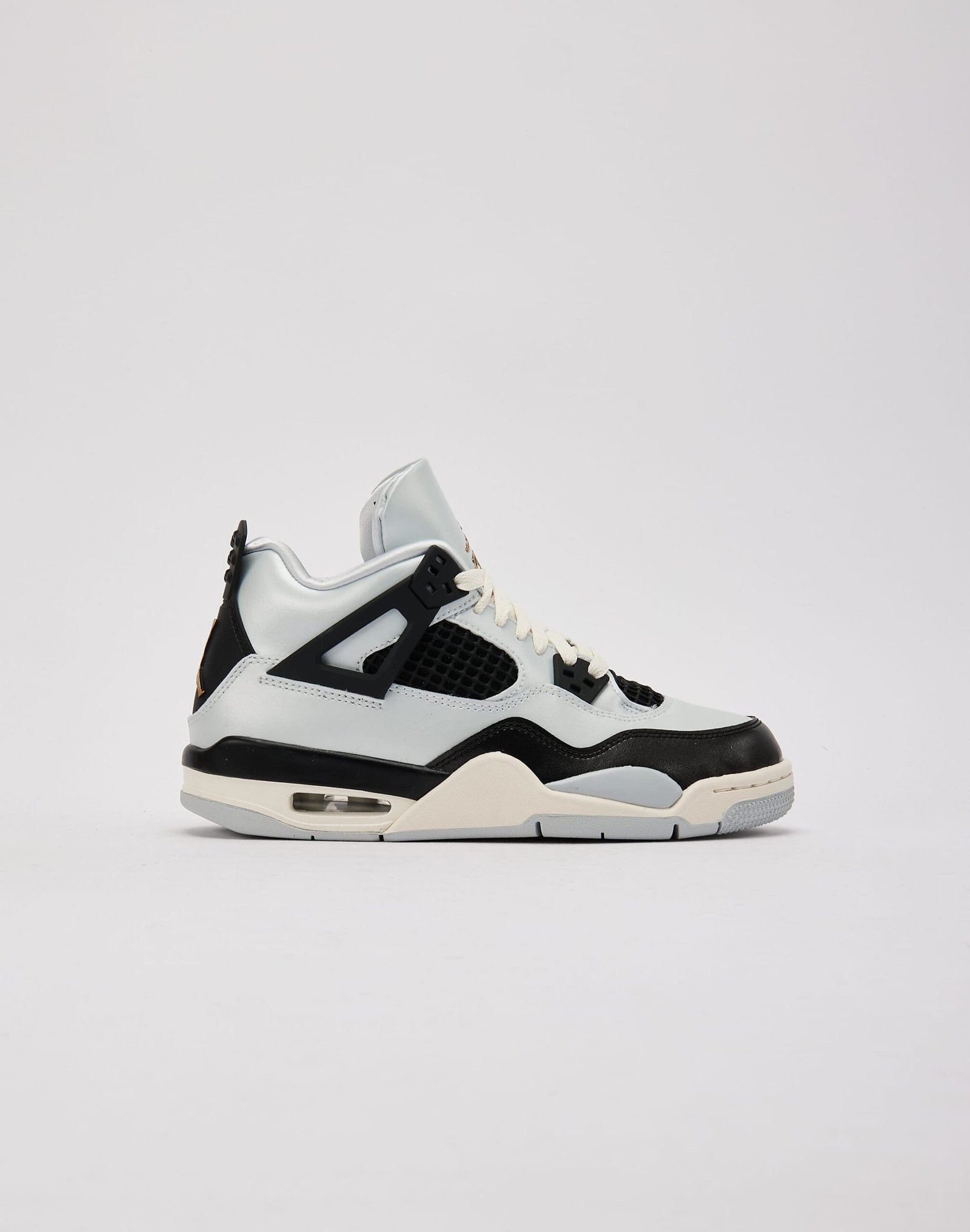 The Air Jordan 4 triumphantly returns with a new ‘Pure Platinum’ paint job. The pristine leather upper sets the stage for accents of black and ‘Metallic Gold,’ which combine for a clean, classic look.