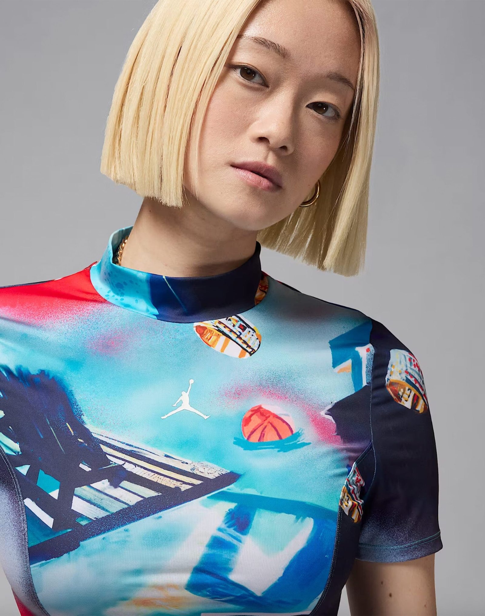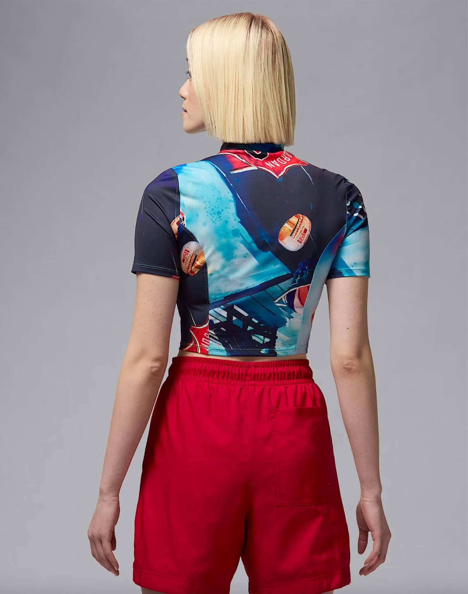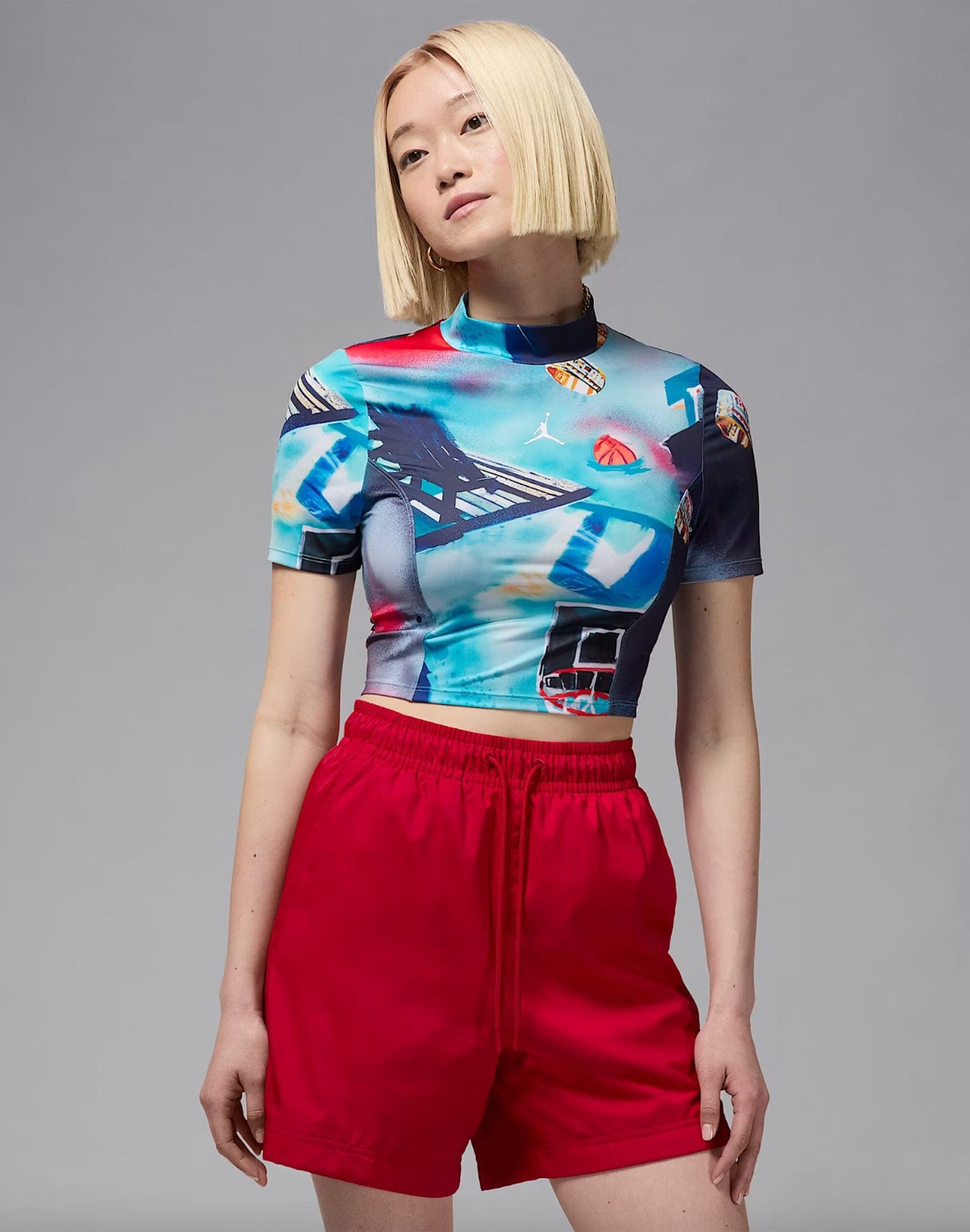 Crafted from soft, stretchy knit fabric, this form-fitting top makes a statement with its bold allover print, mock neck, and cropped hem.