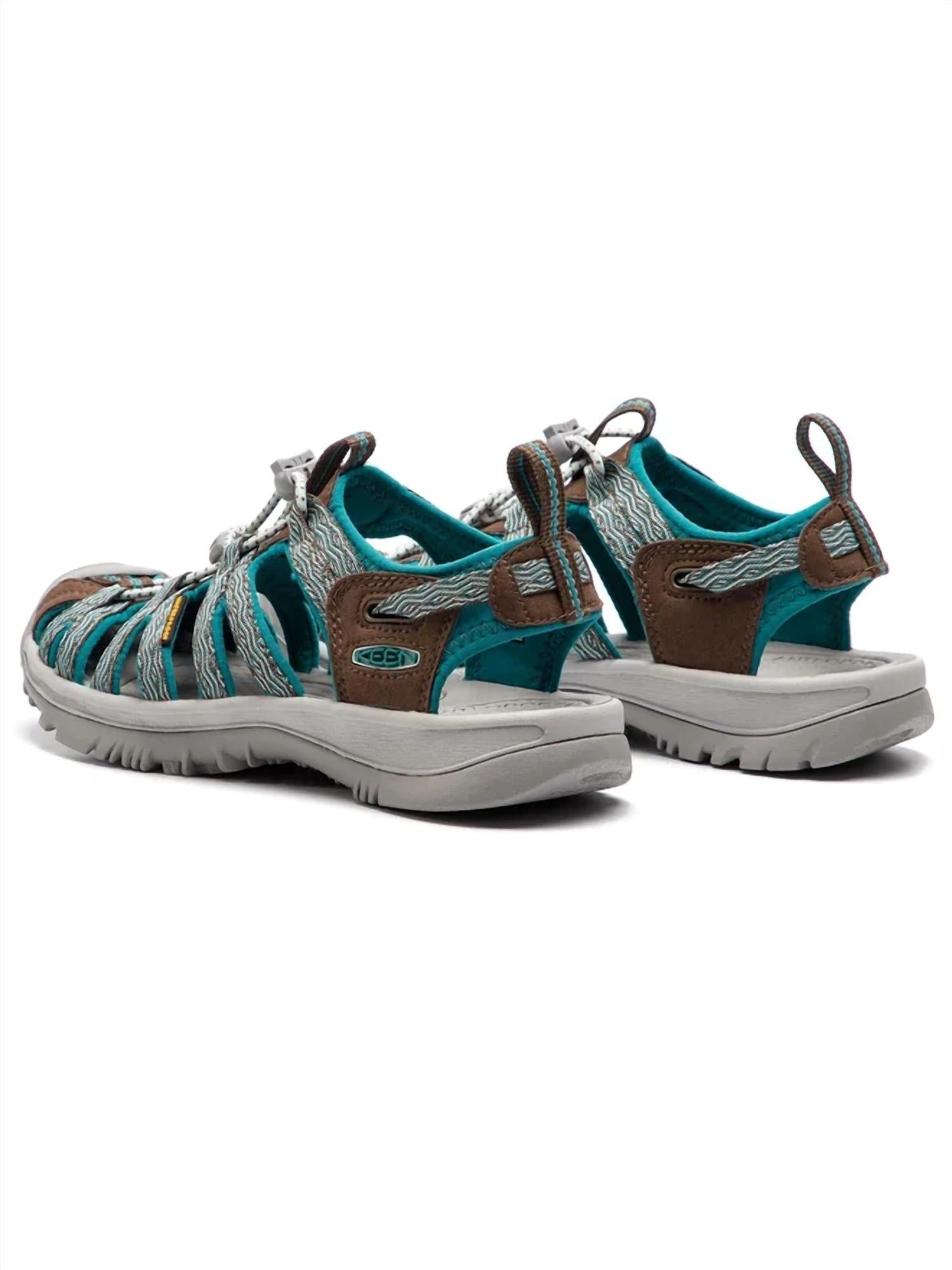 Flowy dresses, cropped pants, and even jumpsuits… this sandal works with them all!Step into adventure with the Keen Women’s Whisper Closed Toe Sandals in a playful Canton/bayou colorway. These lightweight sandals feature an elastic closure system for a customized fit and boast a quick-drying polyester upper for easy maintenance. The contoured footbed, crafted from EVA with KEEN technologies like Metatomical Footbed and KEEN Dry Waterproof, ensures all-day comfort and support. Designed for long hikes or waterfront activities, the non-marking outsole offers excellent shock absorption and grip.