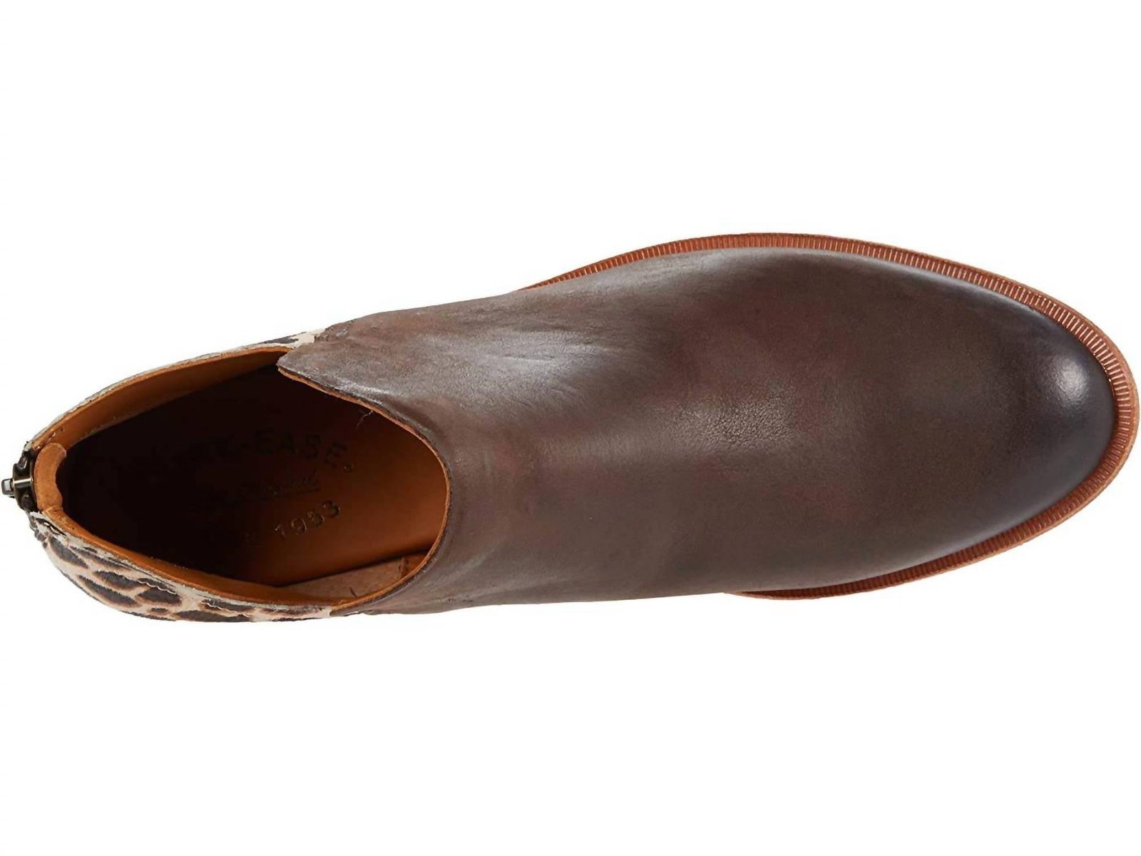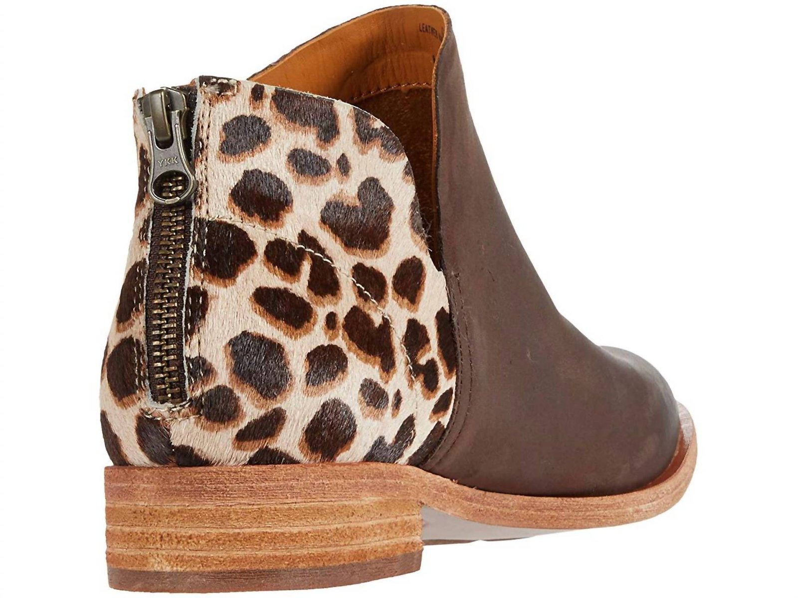 Say hello to the perfect, most versatile boot. The ankle height makes this style easily transition from day to night. Wear them with your favorite skinny jeans and tee for a more laid back look, or pair them with your favorite mini dress and jacket for a night out on the town.Introducing the Women’s Renny Leopard Booties by KORK-EASE, a stunning addition to your fall wardrobe with a dark brown hue that embraces the Y2K trend. Crafted from full-grain leather, suede, or a full-grain leather and haircalf combination, these shoeties feature thoughtfully placed side cut-outs for a unique flair. They come with a leather lining, cushioned leather footbed, and a sturdy leather and rubber outsole for ultimate comfort. The back zipper allows for easy on-and-off, and the block heel with a round toe shape is perfect for travel.