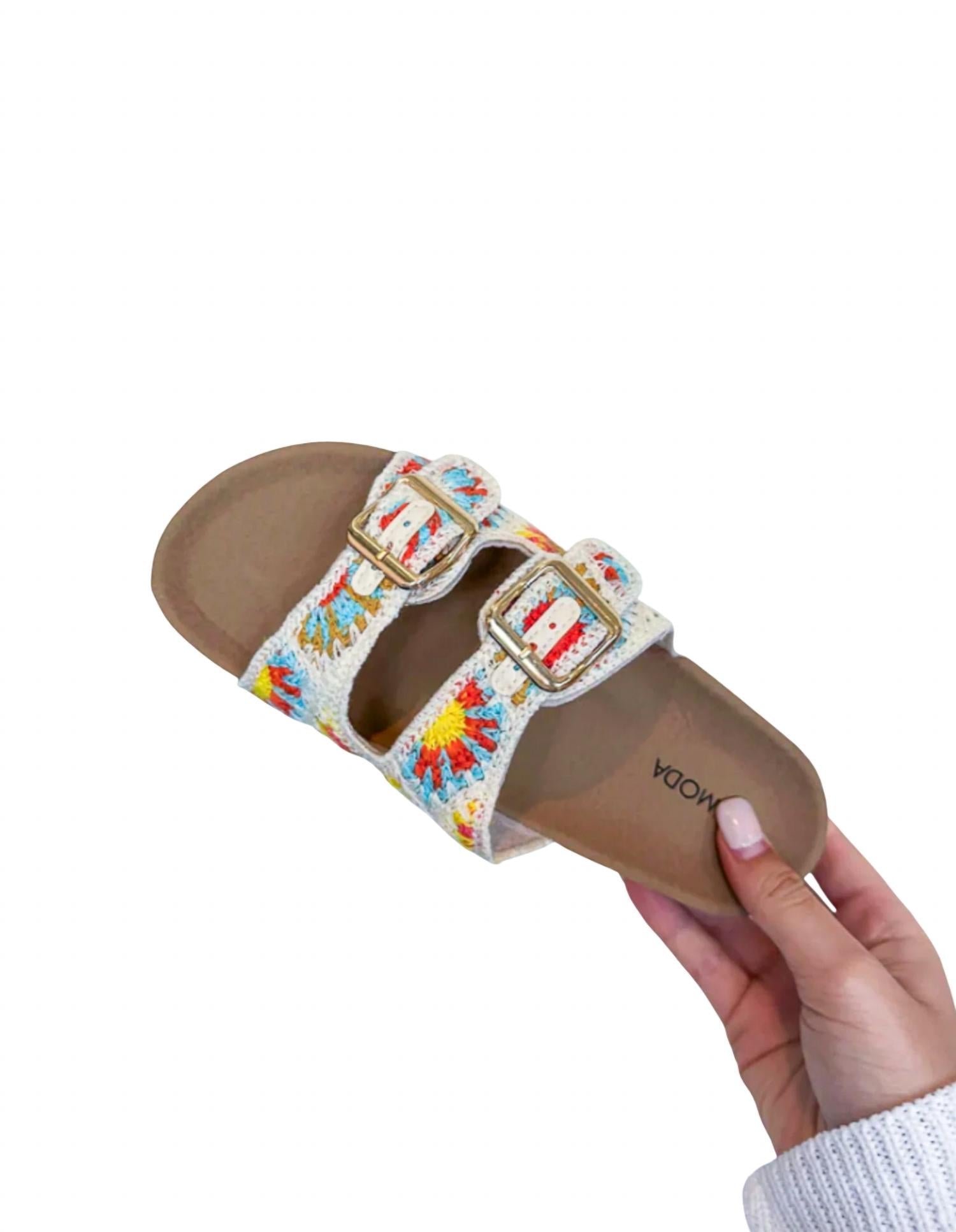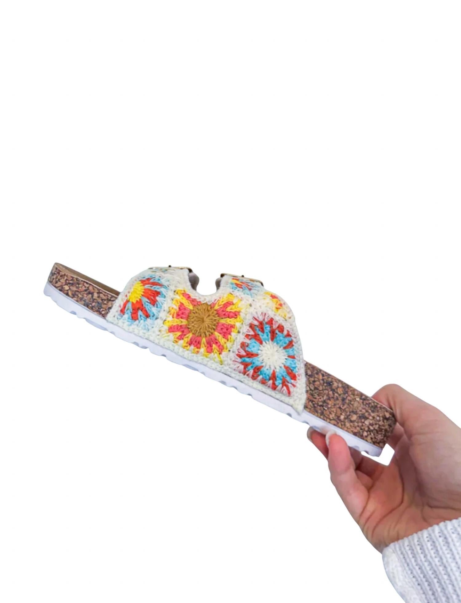 These slip-on crochet sandals feature adjustable buckle straps, an open-toe design, and a suede sole for added comfort and style.