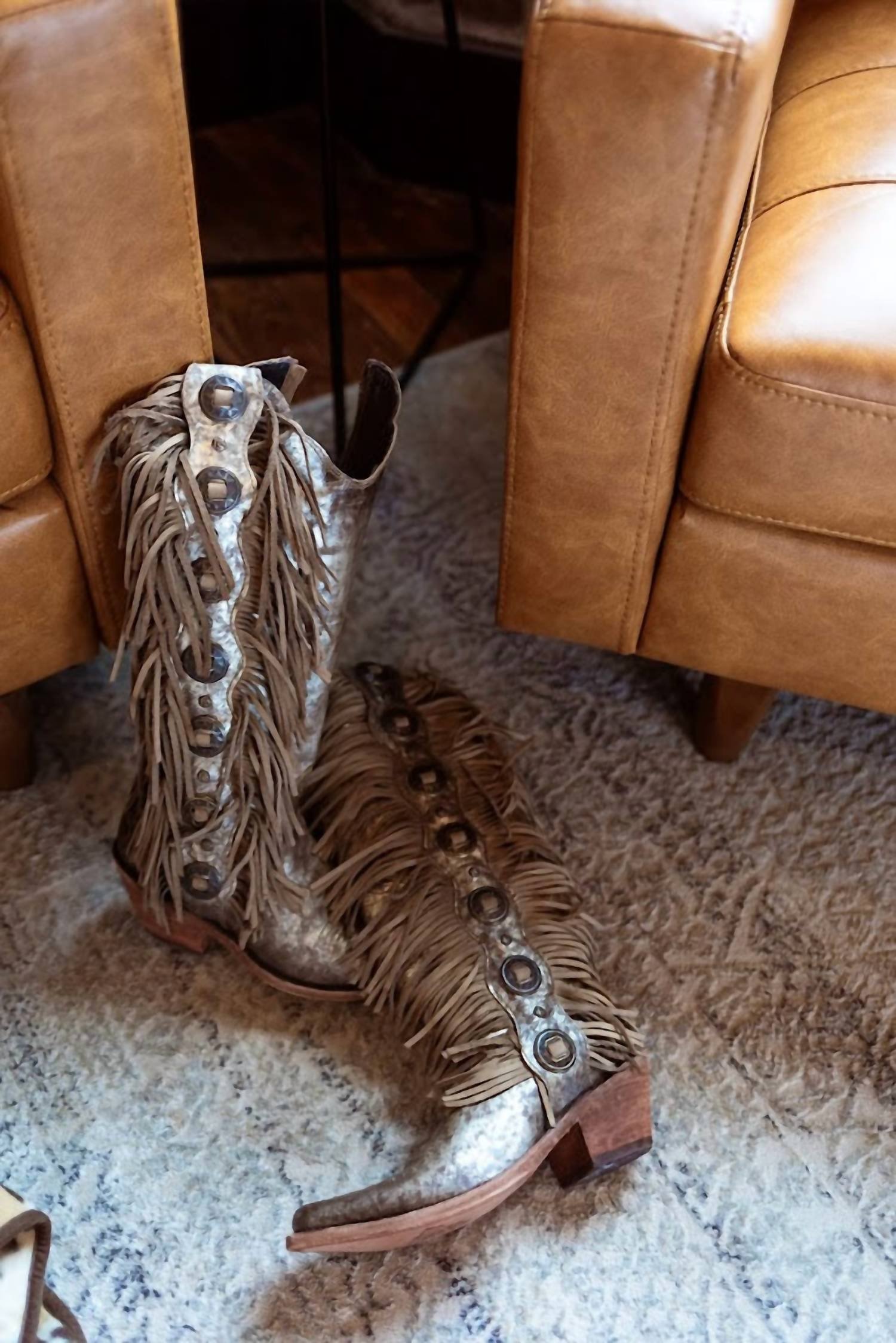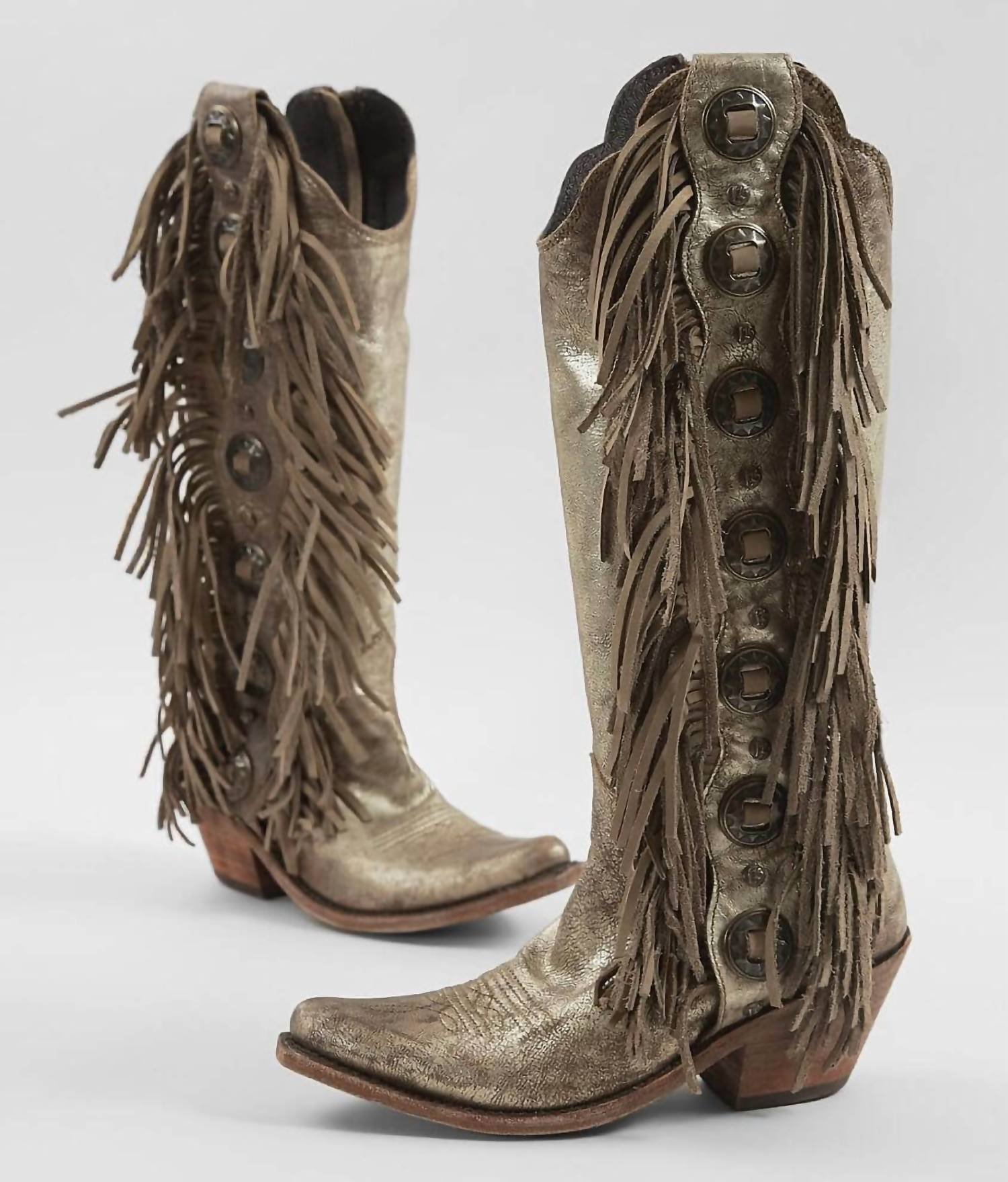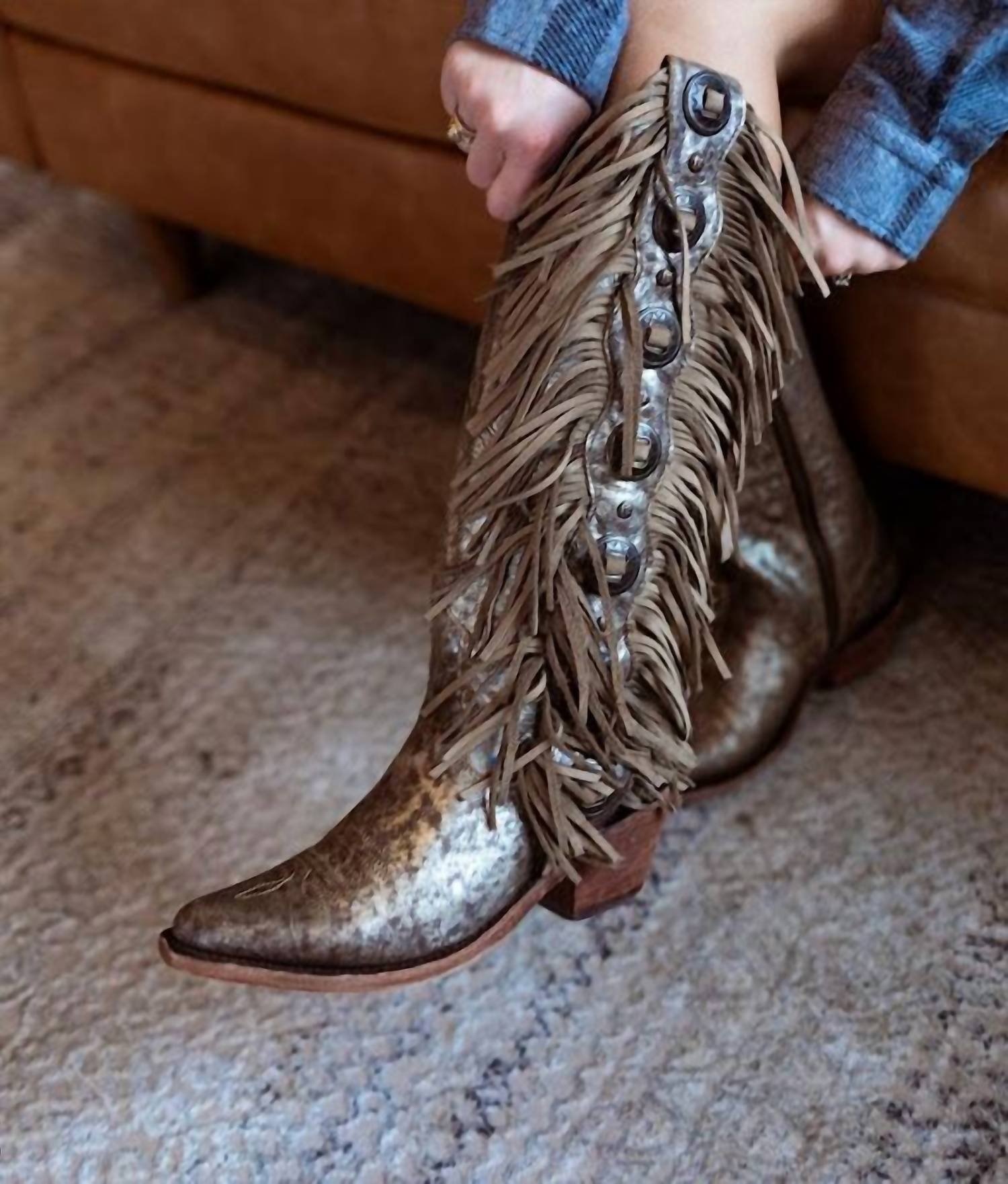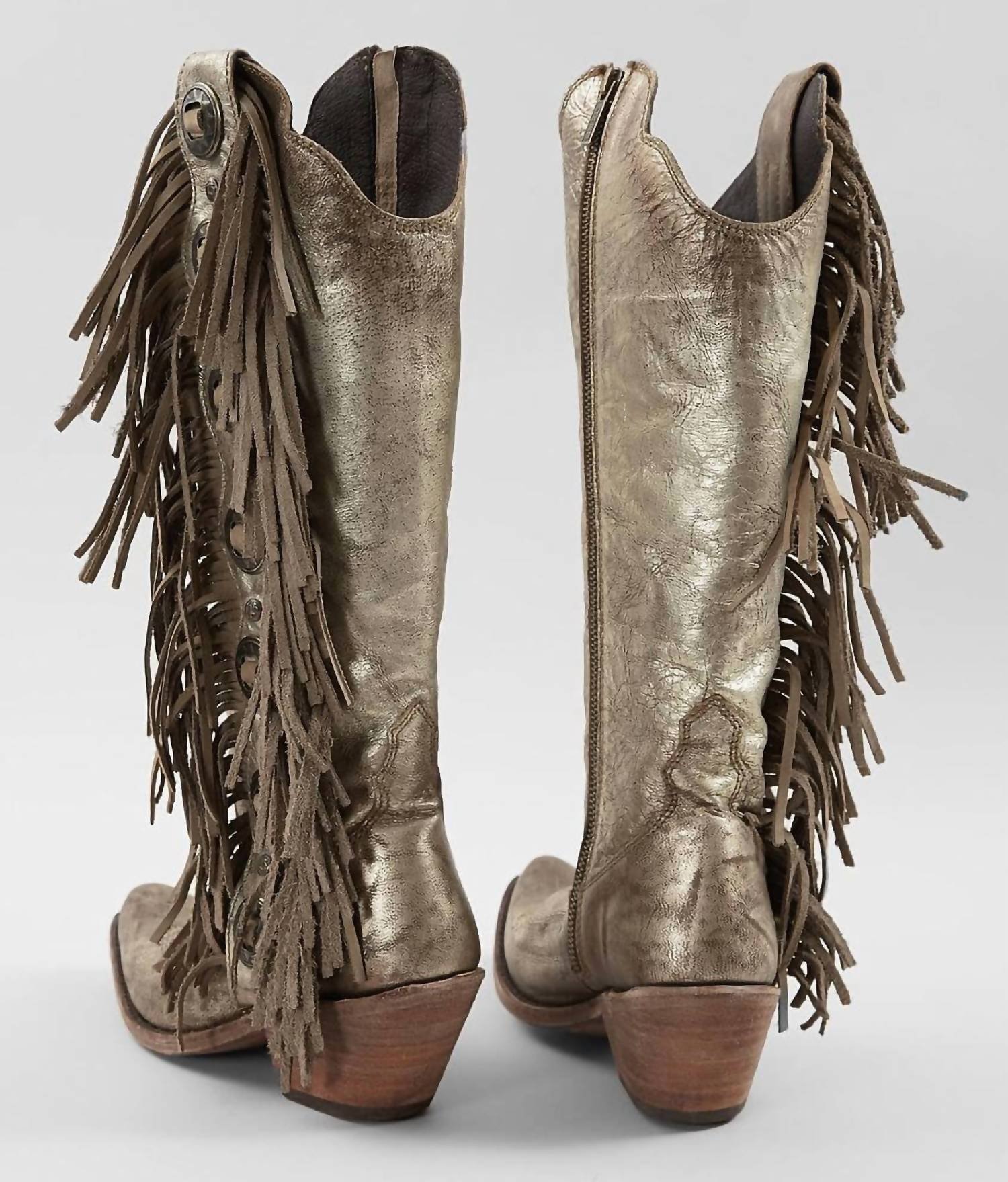 Step out in confidence and showcase your impeccable taste with these fashionable and versatile boots. Their classic style will have you reaching for these boots season after season.Step into style with the Women’s Ophelia Fringe Boot by Liberty Black, a stunning addition to any wardrobe. These heeled boots boast a stylish stonewash finish and feature a 16-inch shaft height with a narrow round toe for a sleek silhouette. The 2.5-inch heel height provides an elegant lift, complemented by an easy inside zip closure. Perfect for women seeking a unique touch with conchos and fringe detailing.