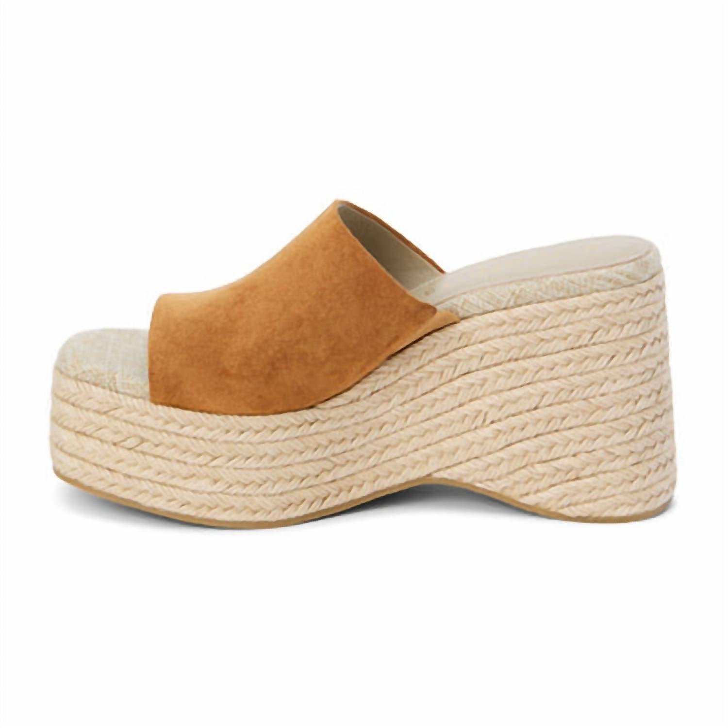 Classicly cute and all-day-wearable. We love this sandal.Step out in style with the Women’s Sorrento Sandal by Matisse, perfect for your boho chic summer wardrobe. This cognac-toned wedge sandal boasts a synthetic suede upper, paired with a padded insole for comfort and an easy slip-on design. The sandal’s wedge heel stands at a striking 4 inches (10.16 cm), with a 2-inch (5.1 cm) platform providing an elegantly elevated silhouette. Imported and featuring a synthetic leather lining, it combines fashion and practicality for any vacation occasion.