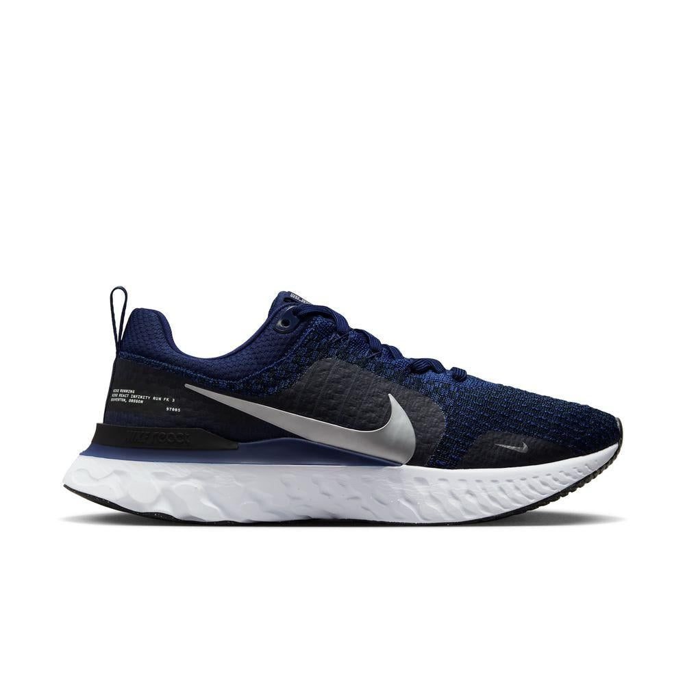 Nike React Infinity 3Men39s Road Running ShoesStay on your feet with soft and supportive cushioning built to help keep you on the run A wider forefoot and higher foam stacks provide cushioning to help keep you fresh giving you the peace of mind to pound the pavement every day The springy responsiveness will surprise you too adding an element of pure speed to 1 of our most tested shoes to help you go longer faster and farther than ever For this version we updated the design of our iconic logo and added fresh colorsSmooth RideNike React technology is a lightweight durable foam that delivers a smooth responsive ride Shaped like a rocker the foam provides support for the 3 phases of a runner39s stride It offers flexibility when your foot rises off the ground a smooth ride when your foot is moving forward and cushioning at ground contactBreathable at All TimesAn advanced Flyknit upper provides breathability where you need it most It39s strong and durable helping to keep your foot secure with every mile Flywire technology offers extra support and stability through the midfootAdjusted TongueFully adjustable Flyknit tongue can be pulled out for a style perspective or toggled and tailored to different types of runs It works with Flywire to create that justright sensation of comfort and security Nonknit collar is made of supersoft foam textile that complements the FlyknitA wide shape provides a more stable ride helping release energy with every stepIncreased rubber at the outsole helps deliver traction and durabilityCushioned collar provides soft comfortLoop at the heel offers easy on and offnbsp