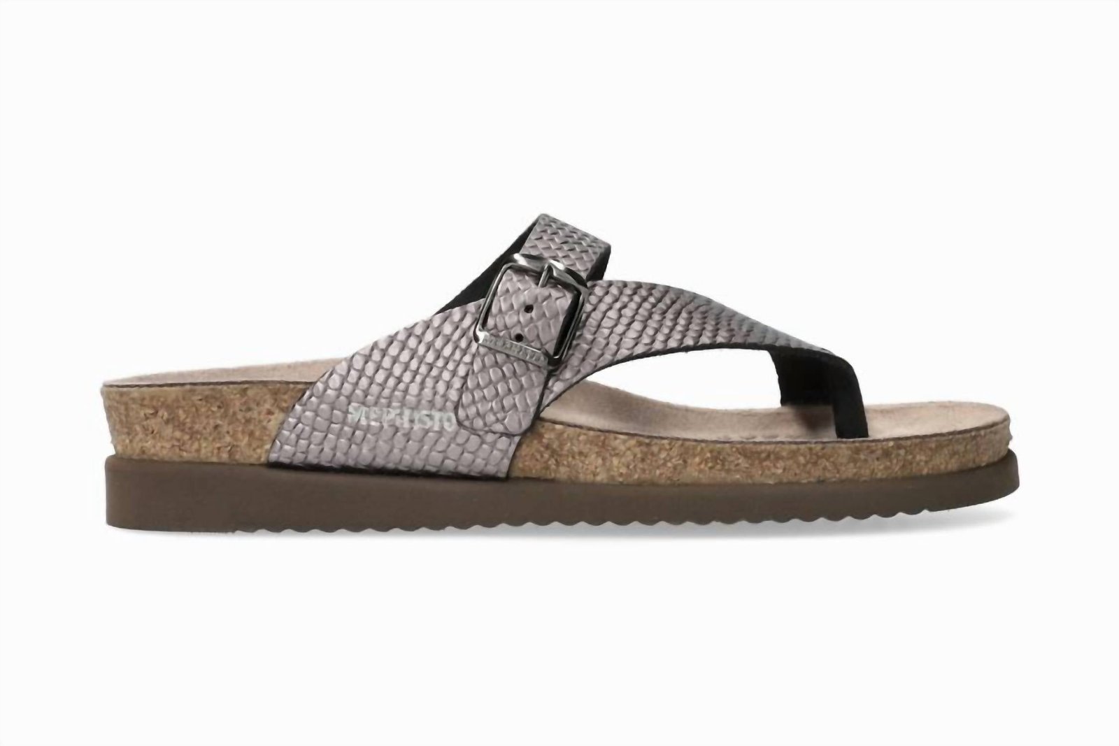 Classicly cute and all-day-wearable. We love this sandal.Step into comfort with the Women’s Classic Helen Sandal by MEPHISTO, beautifully crafted in a Pewter Reptile leather finish. Featuring a standard G width and innovative SOFT-AIR technology in the cork midsole, these sandals ensure supreme comfort with AIR-RELAX technology offering unmatched arch support. Designed with a flat heel for easy wear, the buckle closure allows for a perfect fit and ease of adjustment. With no lining required, these sandals promise durability and style for your warm weather adventures.
