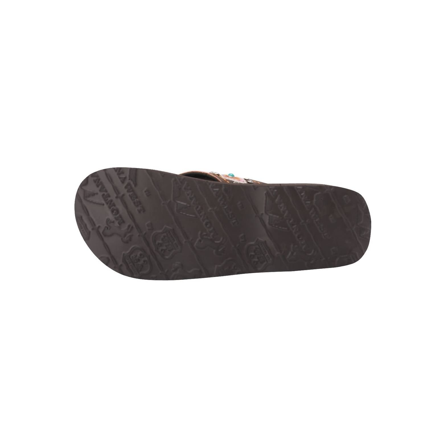 This sandal will take you from brunch to dinner and everything in between.Elevate your summer wardrobe with the Women’s Mandala Wedge Flip Flop by Montana West in classic brown. These stylish sandals feature an open toe design and boast exquisite mandala embroidery and tribal patterns adorned with sparkling rhinestone conchos for an elegant boho look. The 1.75′ wedge heel provides a subtle lift while maintaining comfort, thanks to the cushioned underlay of the polyurethane leather straps.