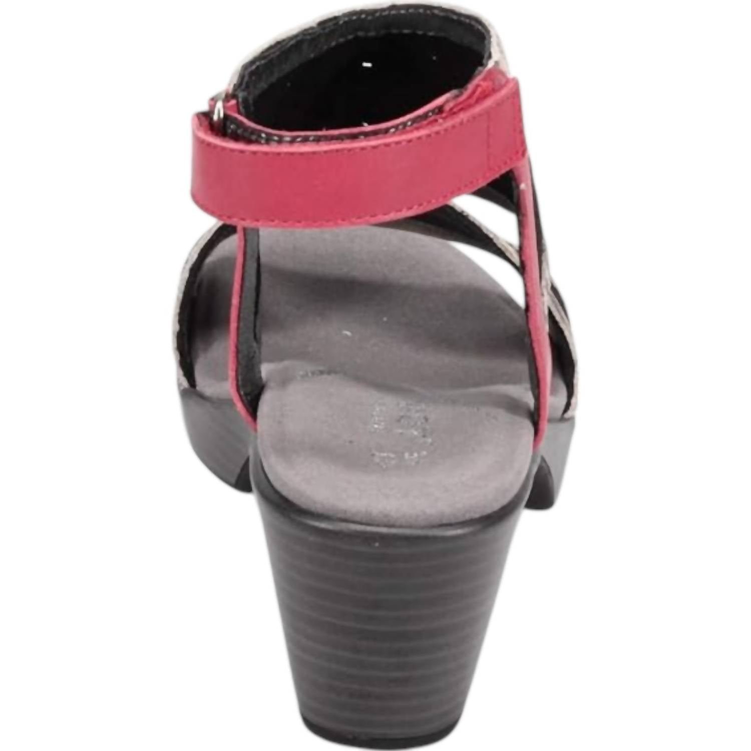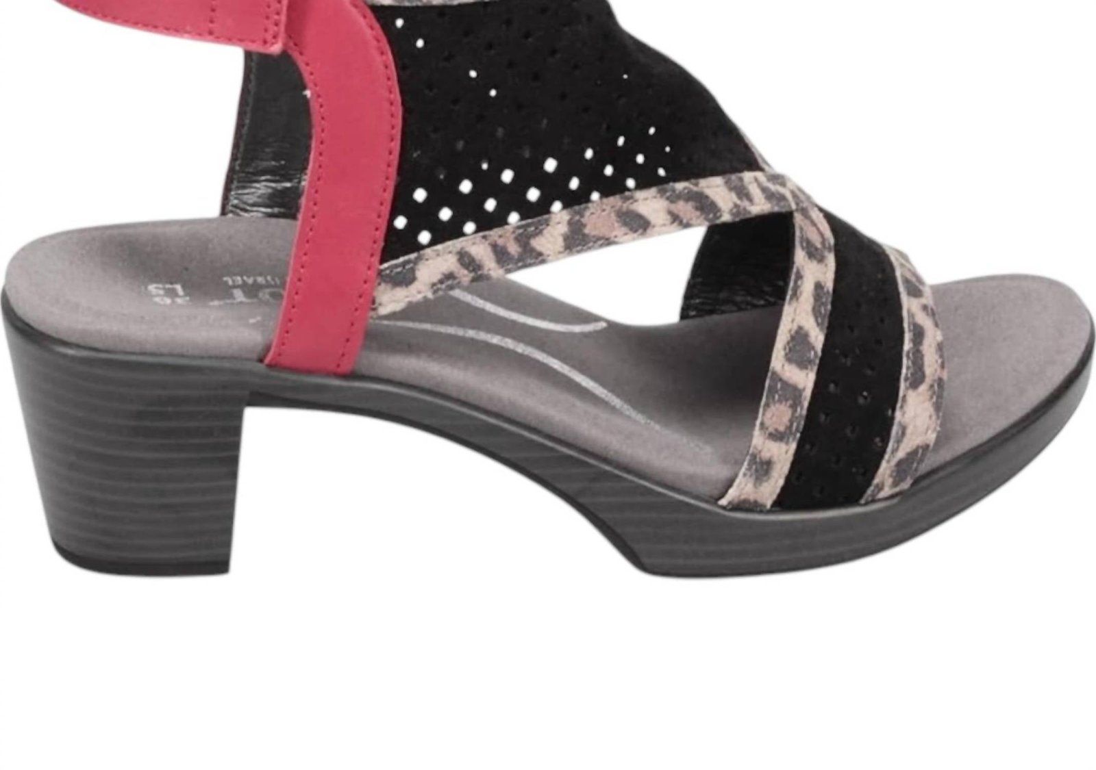 The perfect height for day to night.Step into style and comfort offered in a striking black, cheetah, and kiss red colorway. Feature a hook and loop closure on the back strap for easy wear. With an open toe and block heel design that offers the appearance of a 2.25′ heel height, thanks to the innovative Supreme Collection’s metal shank. Made with a polyurethane sole. Crafted for medium width and are true to size.