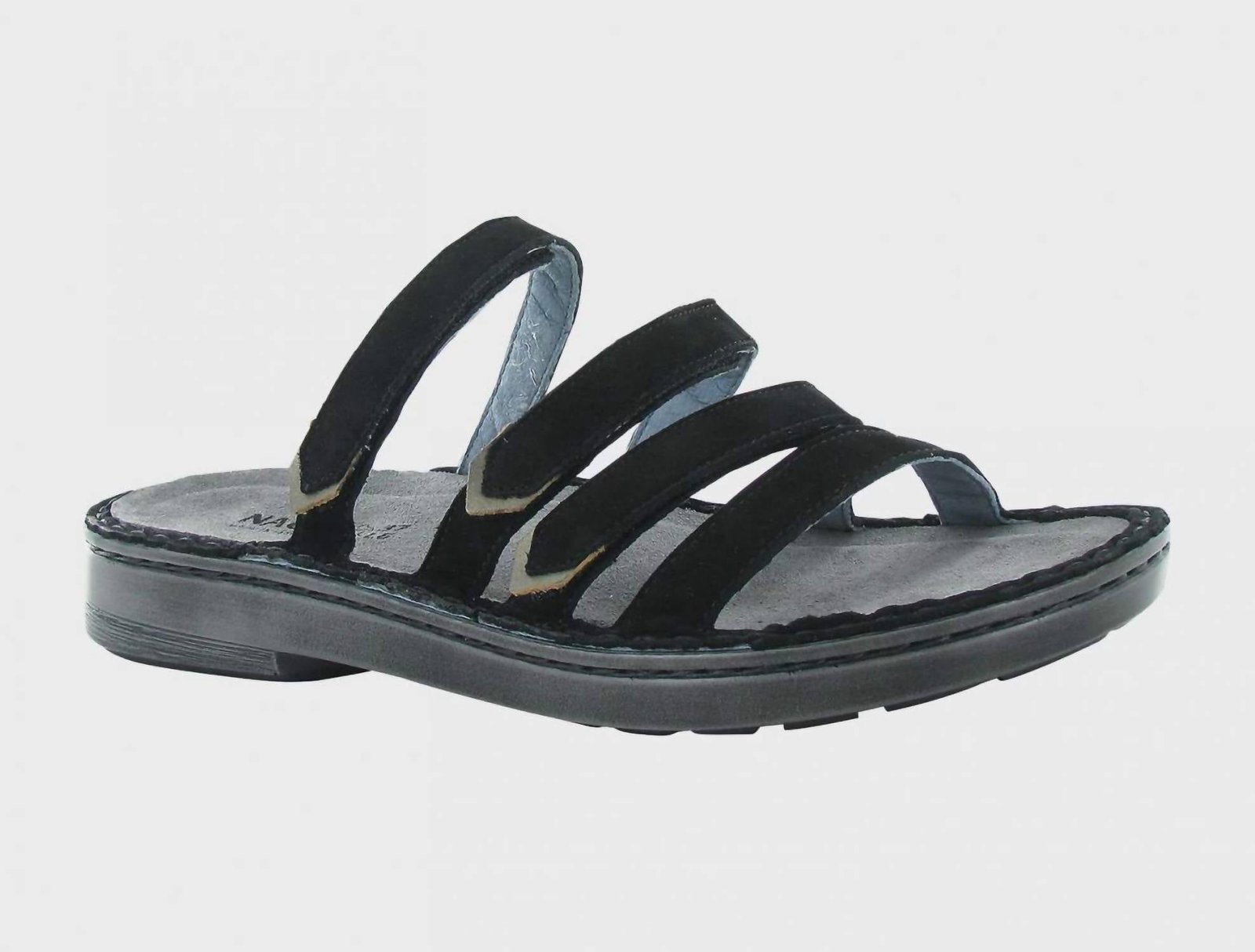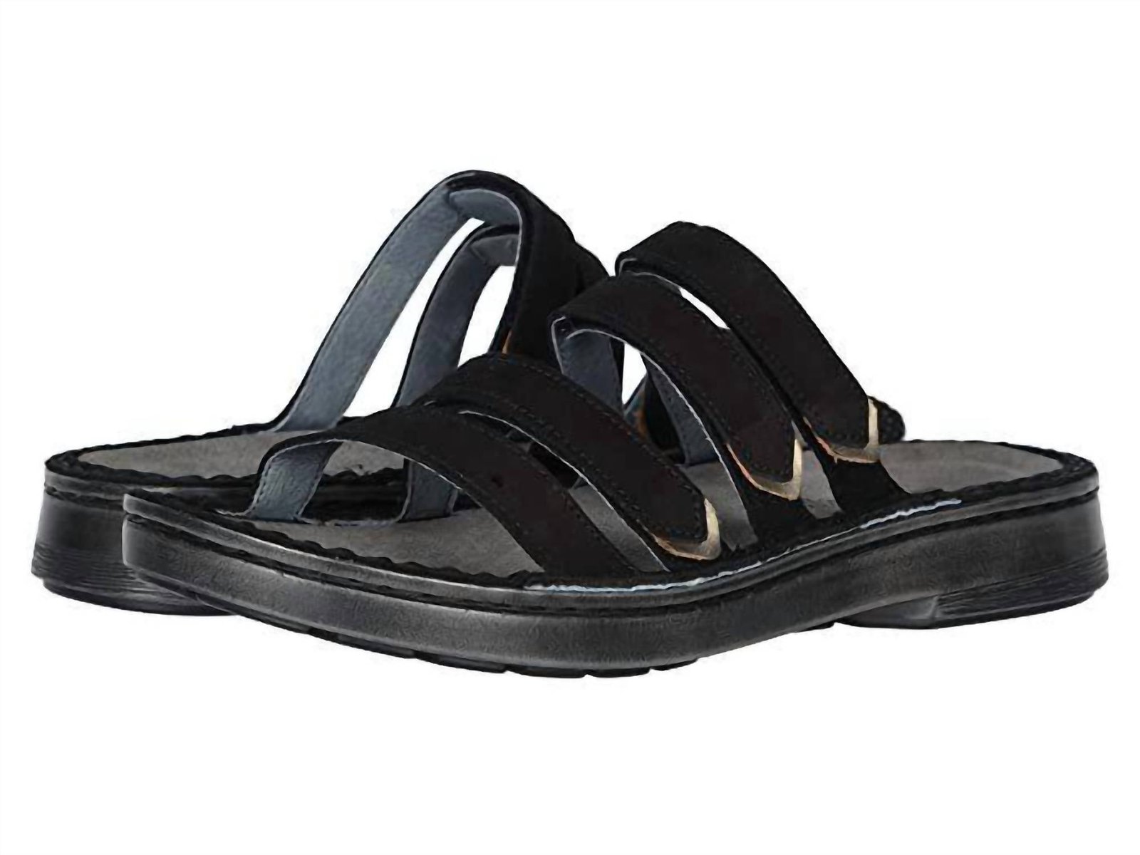 Flowy dresses, cropped pants, and even jumpsuits… this sandal works with them all!Step into summer sophistication with the NAOT Women’s Trevi Slip-on Sandal, a minimalist design perfect for any dinner party. Crafted from elegant black leather, these sandals feature an open toe and a flash of metallic leather at the straps. Designed with a flat heel and medium width, they ensure comfort during adventures at home or away. Ideal for lightweight elegance this summer.