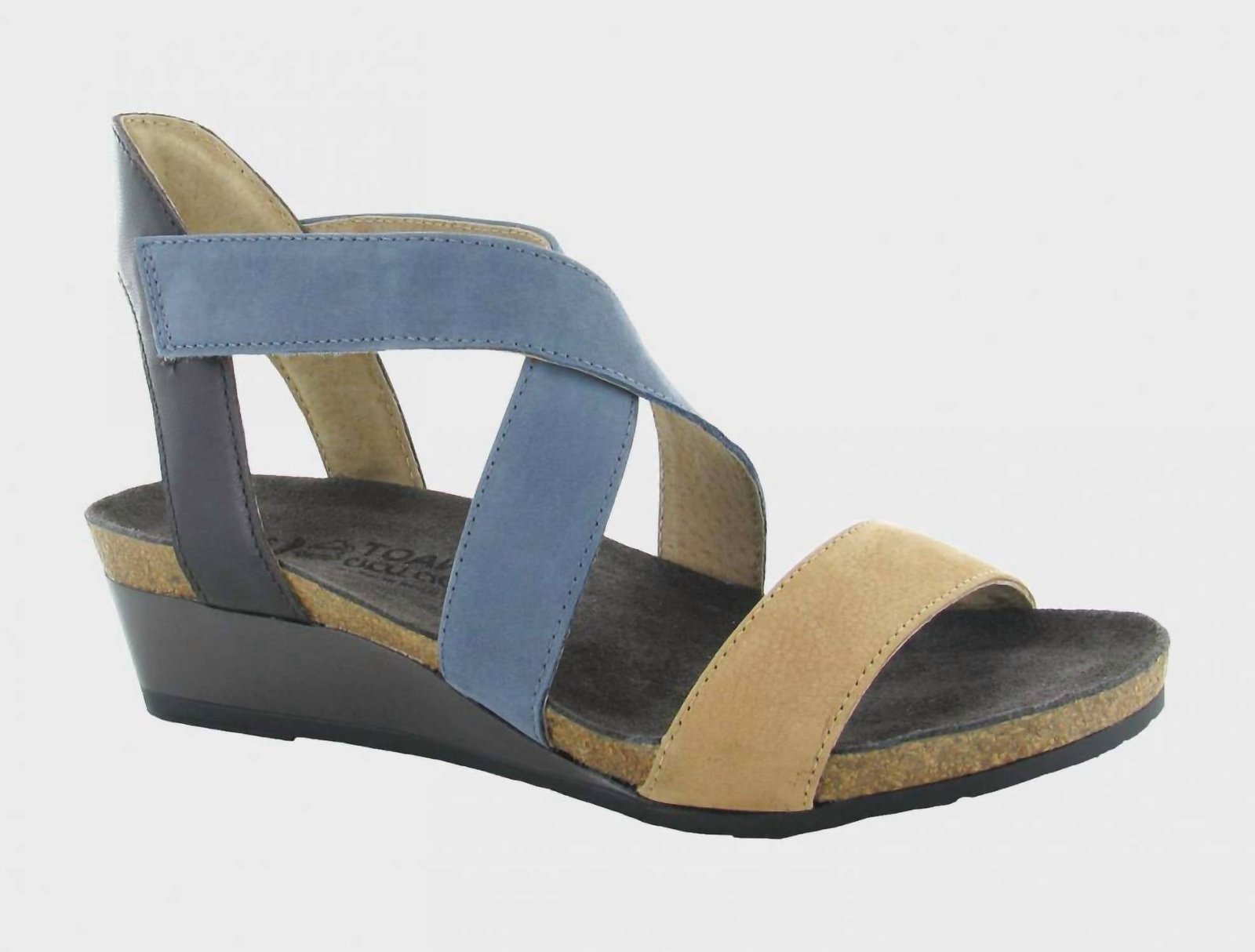 Flowy dresses, cropped pants, and even jumpsuits… this sandal works with them all!Discover the Women’s Vixen Leather Sandal by NAOT, a chic addition to the Fantasy collection that caters to a Narrow-to-Medium width. Made in Israel, this handcrafted sandal features a nude nubuck and feathery blue nubuck upper in a striking color block design. It offers easy slip-on wear with a hook-and-loop strap, breathable leather lining, and boasts a cushioned, anatomic cork and latex footbed for ultimate comfort. Complete with a 1.5-inch EVA outsole and a wedge heel, it’s perfect for boho-chic summer dinner parties.