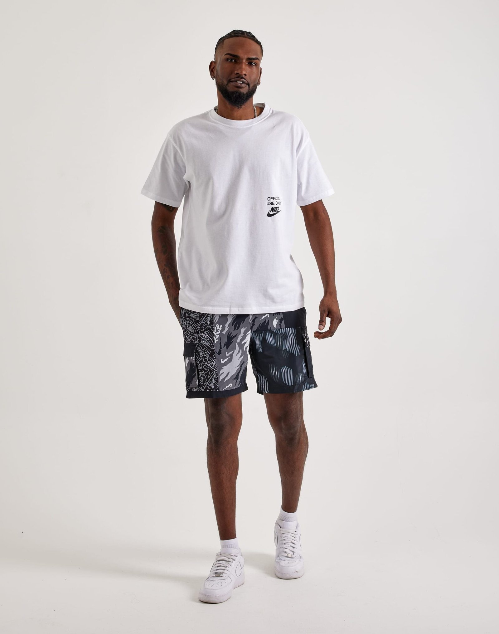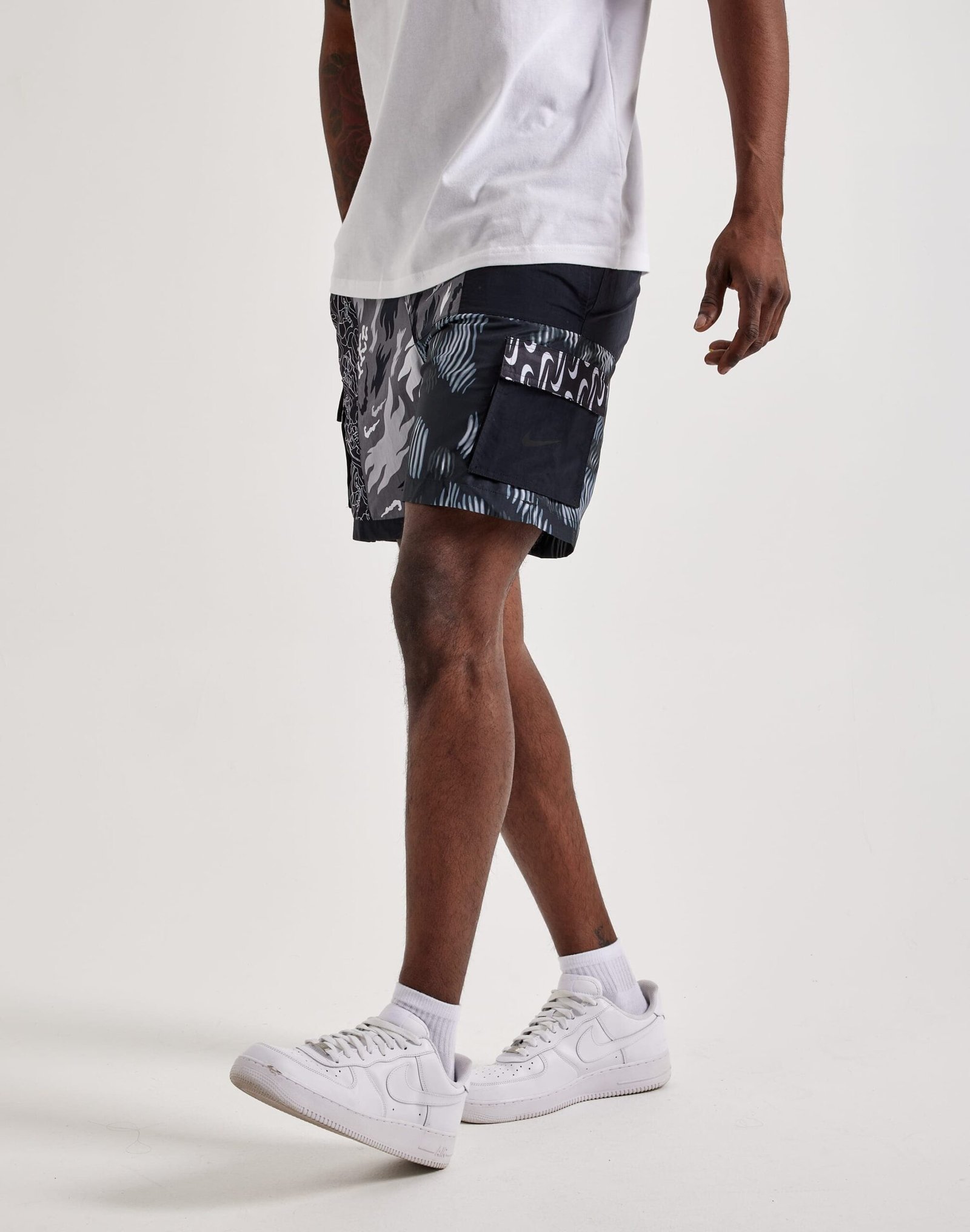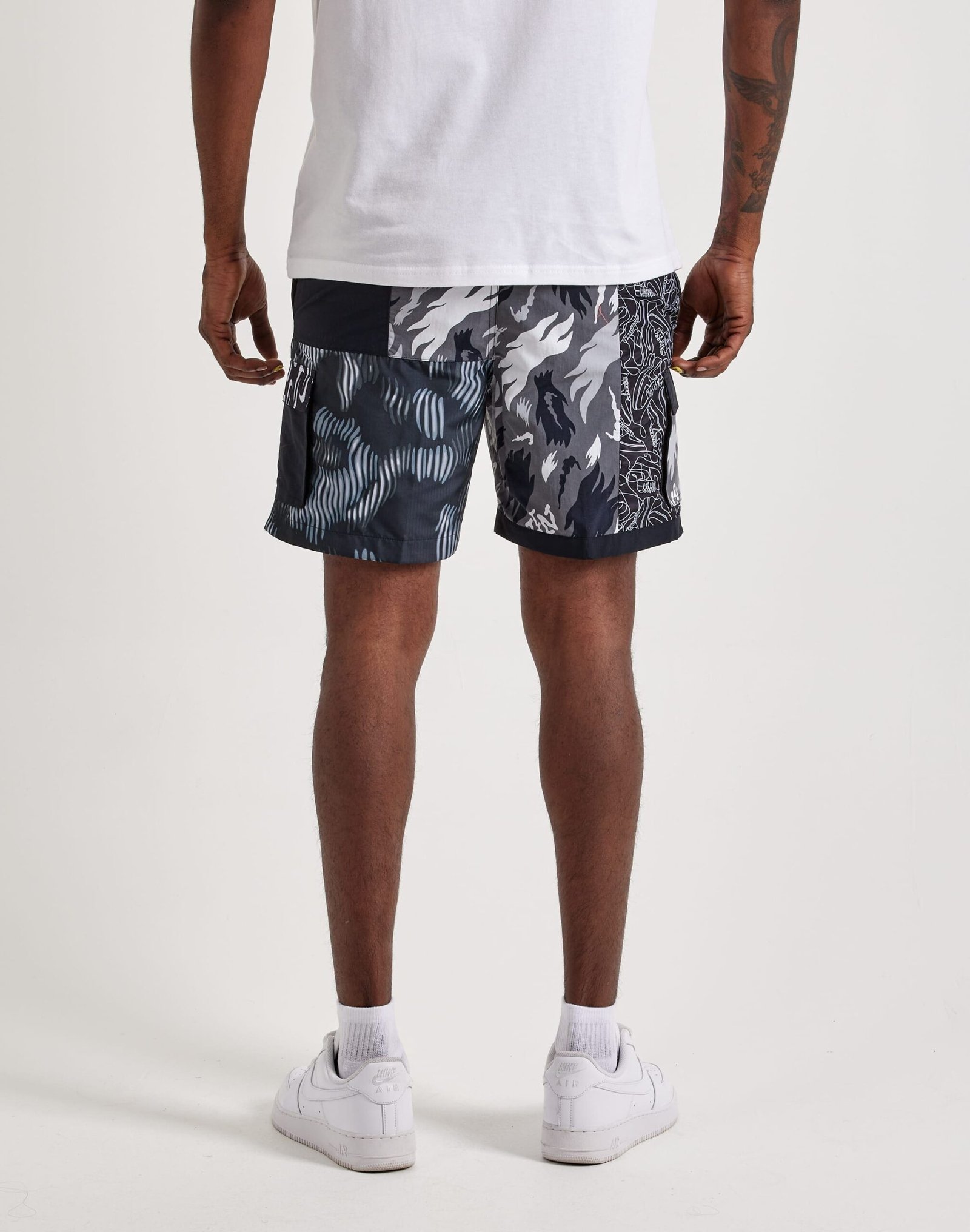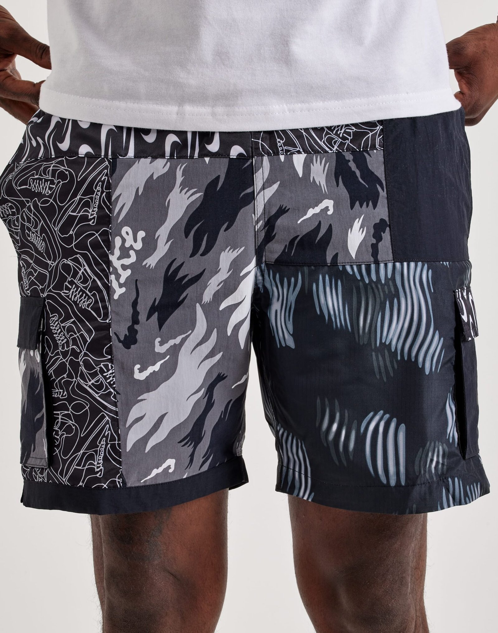 Crafted with a unique patchwork design, these Nike swim shorts combine multiple fabrics for a standout look. Featuring a stretchy waistband with an exposed belt for a customizable fit, mesh pockets for quick water drainage, and a packable pocket that transforms them into a built-in bag.