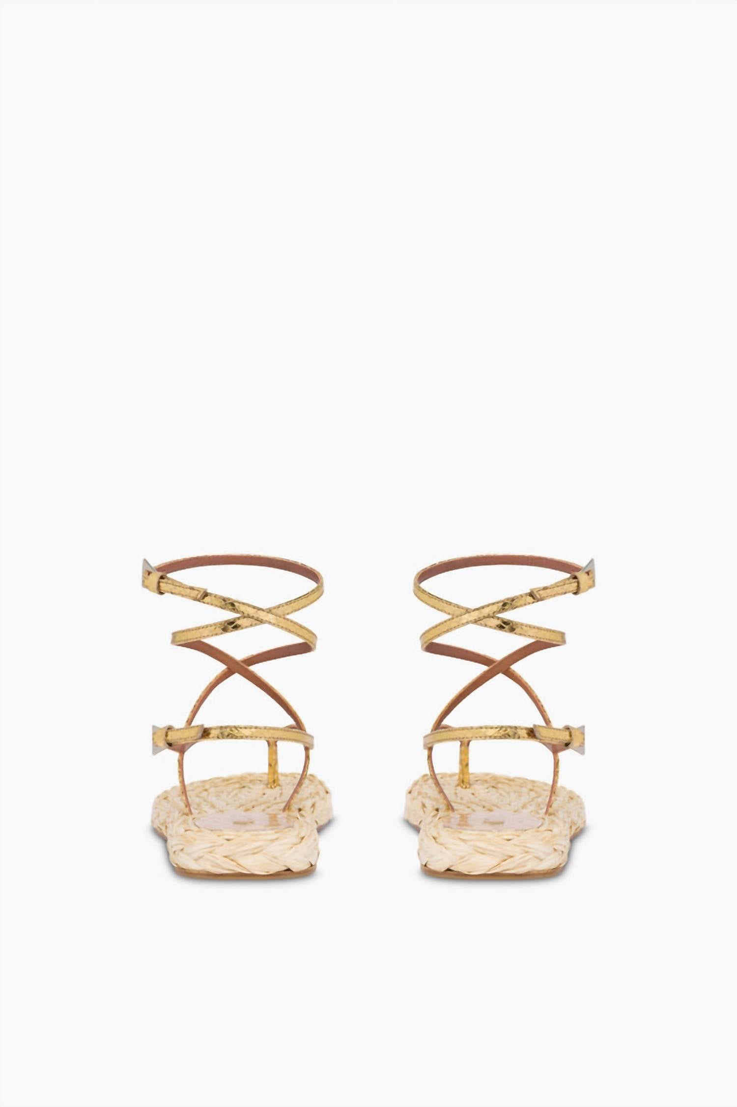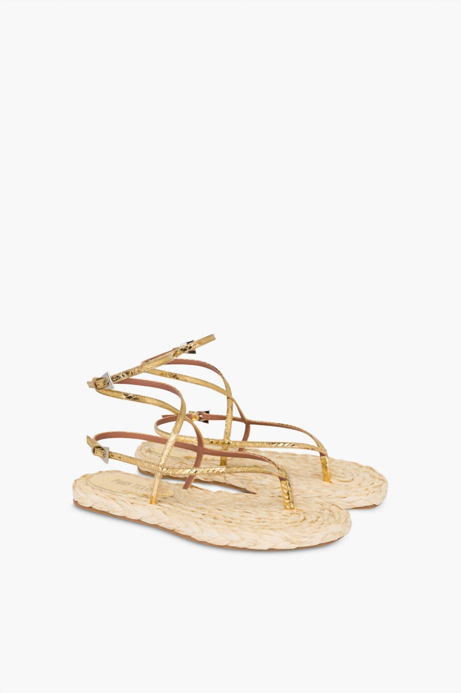 This sandal will take you from brunch to dinner and everything in between.Step into style with the Women’s Hydra Flat Sandal by Paris Texas, a chic choice for any summertime ensemble. These lace-up sandals feature a toe post design in luxurious natural raffia complemented by gold metallic python-print leather. Made in Italy, these sandals boast a flat heel with a height of 0.39 inches, offering both comfort and sophistication. Embrace fashionable flair with this standout accessory that includes a handy dust bag for storage.