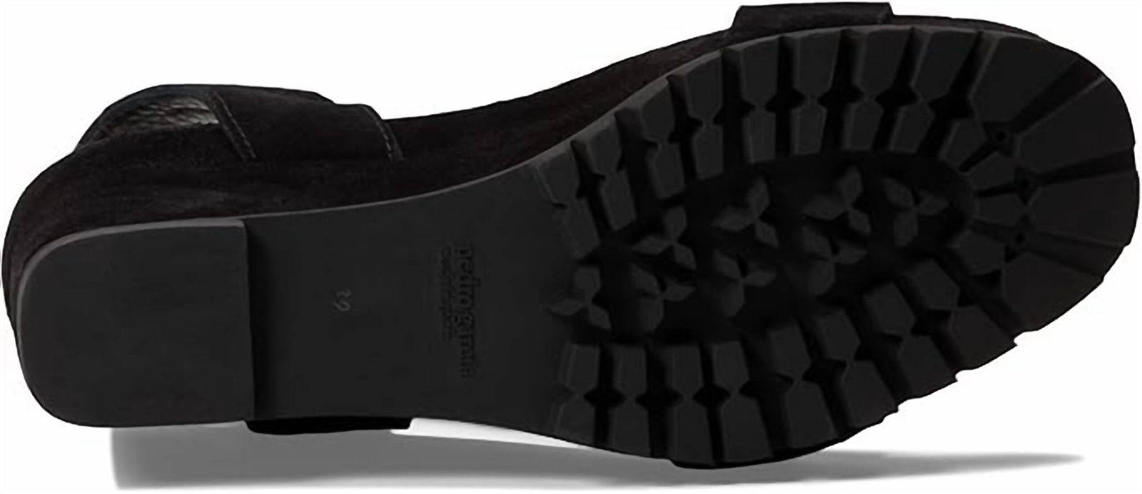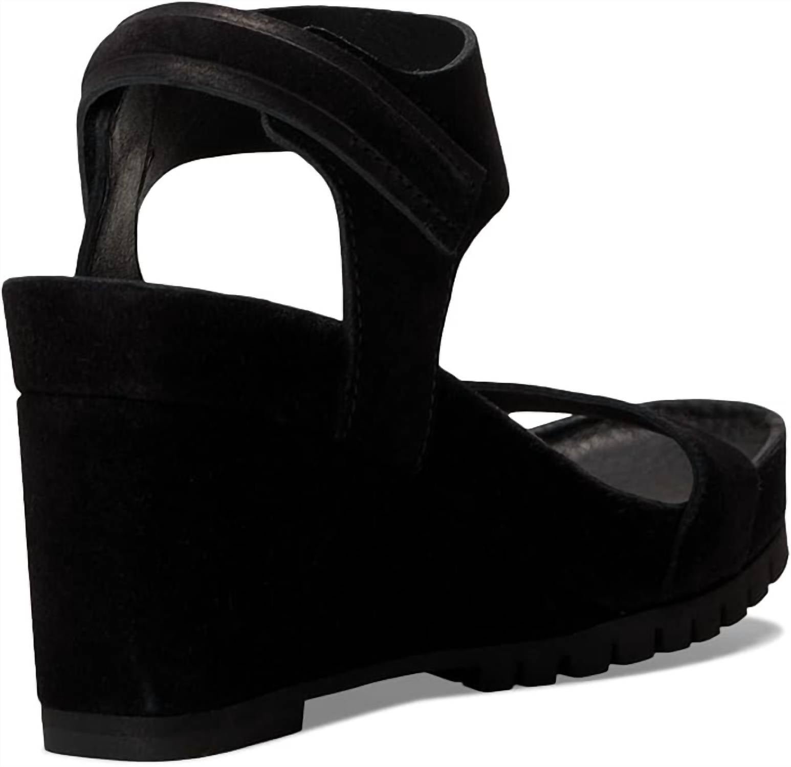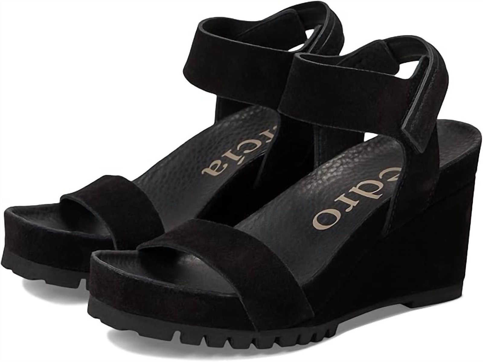 Classicly cute and all-day-wearable. We love this sandal.Step into elegance with the Josette Suede Wedge Sandals by Pedro Garcia, ideal for your next dinner party or New Year’s Eve event. Crafted in Spain, these black sandals feature a platform wedge silhouette and a durable synthetic outsole, complemented by a suede upper and leather lining. The design includes a convenient hook-and-loop adjustable ankle strap for a secure fit. With a high heel height of 3 1/4 inches and a round toe shape, they’re perfect for adding a minimalist touch to your spring wardrobe.