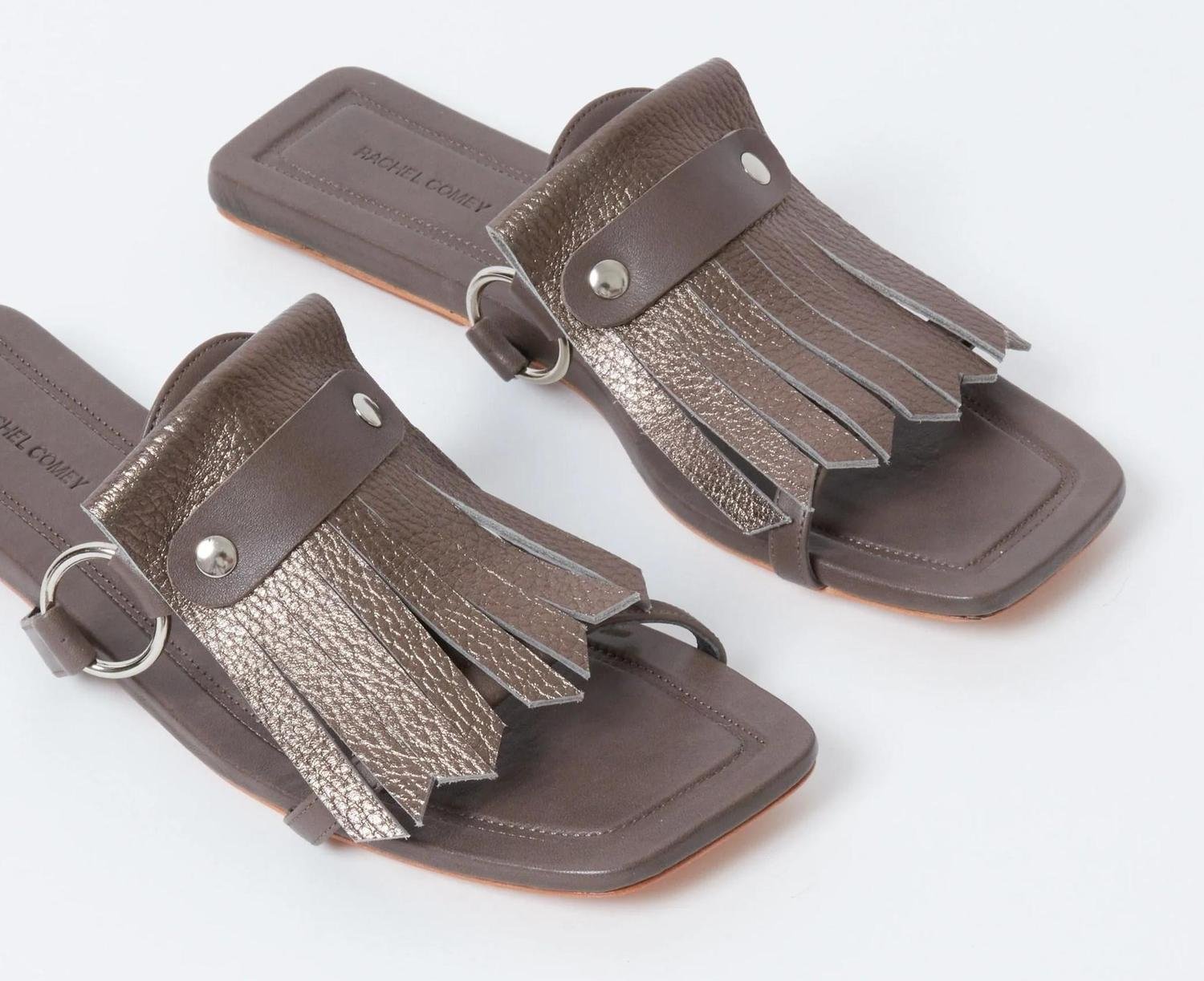 Flowy dresses, cropped pants, and even jumpsuits… this sandal works with them all!Step into summer with the Women’s Fitz Sandal by RACHEL COMEY, a minimalist option for a chic vacation look. These flat sandals feature an open square toe with fringe detailing and metal ring accents along the sides, all crafted from 100% leather. Made in Peru, they offer a style-conscious choice for the fashion-forward adult. Ideal for summer outings, this taupe sandal is a must-have for your wardrobe.