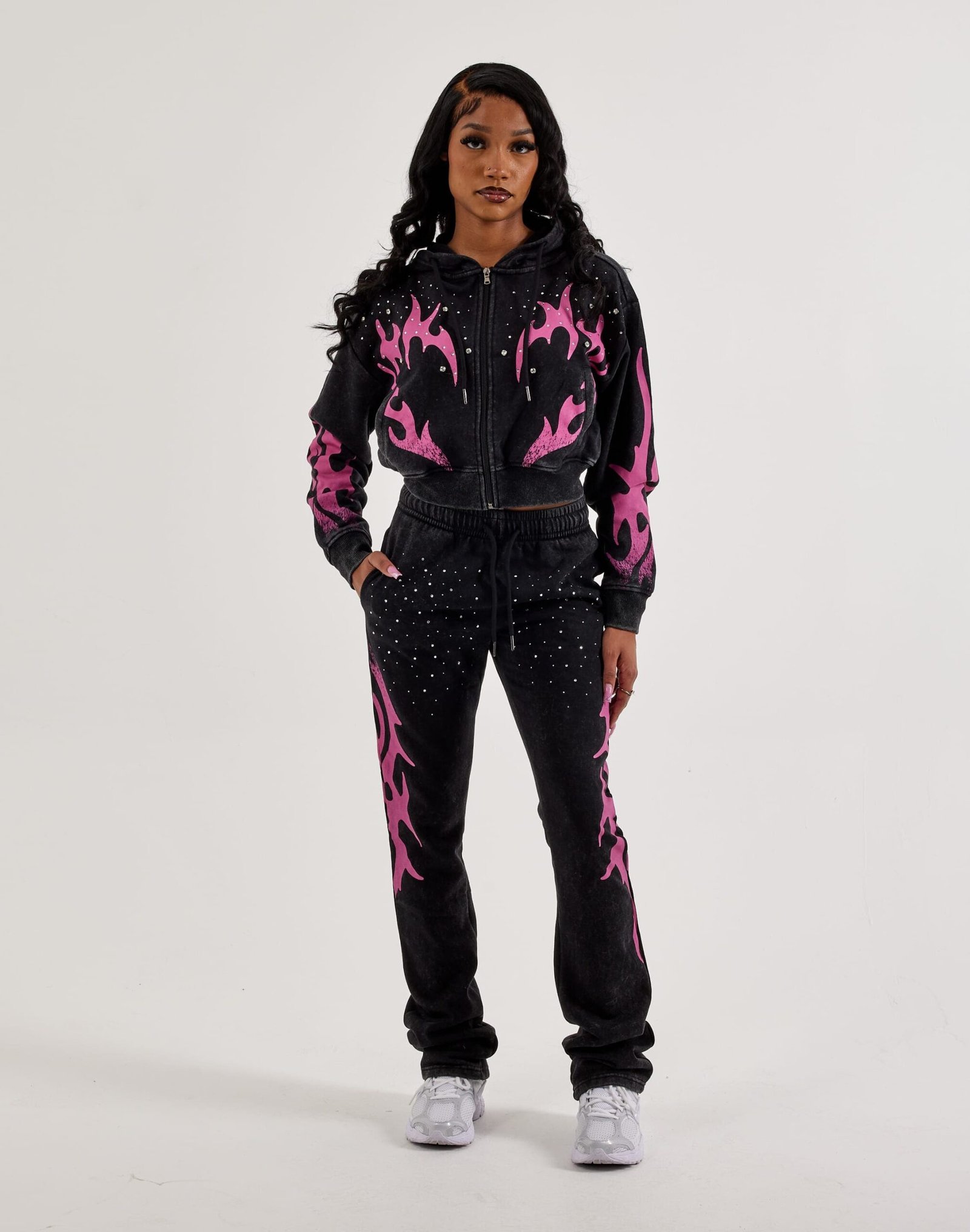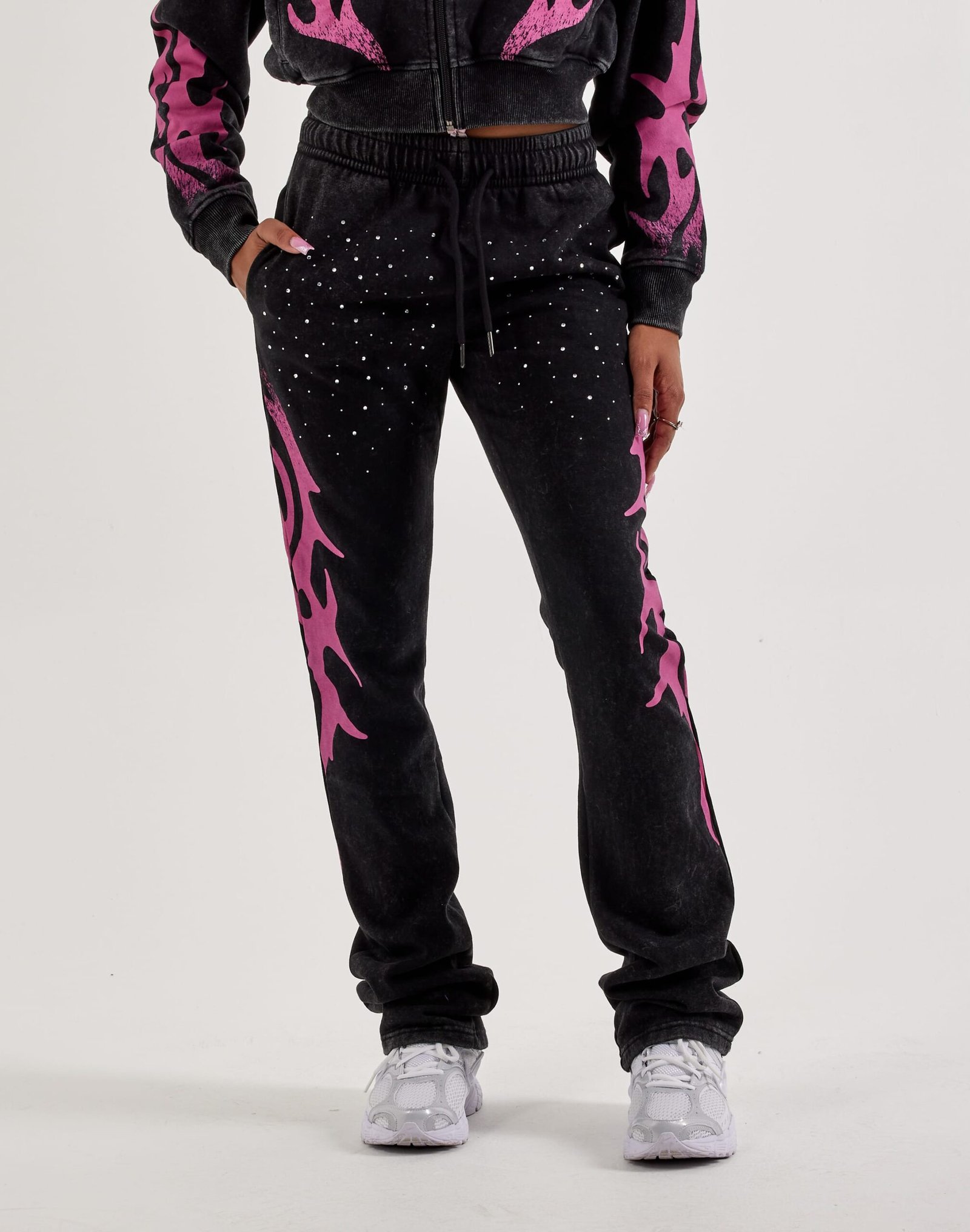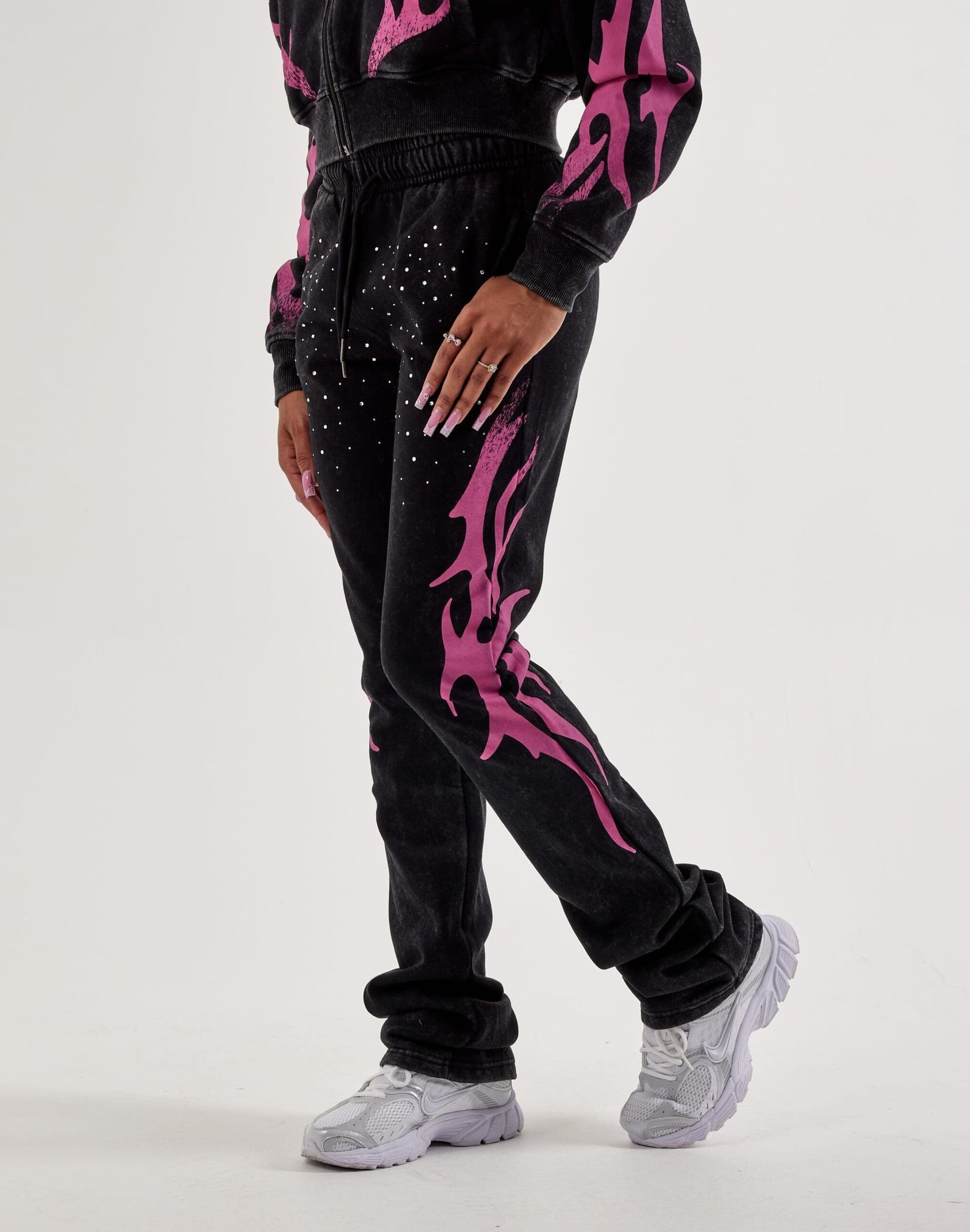The Red Fox Stacked Studded Flame Fleece Sweatpants combine cozy comfort with standout streetwear style. Featuring soft fleece fabric and eye-catching studded accents, these joggers bring an edgy, fashion-forward look to your everyday wardrobe.
