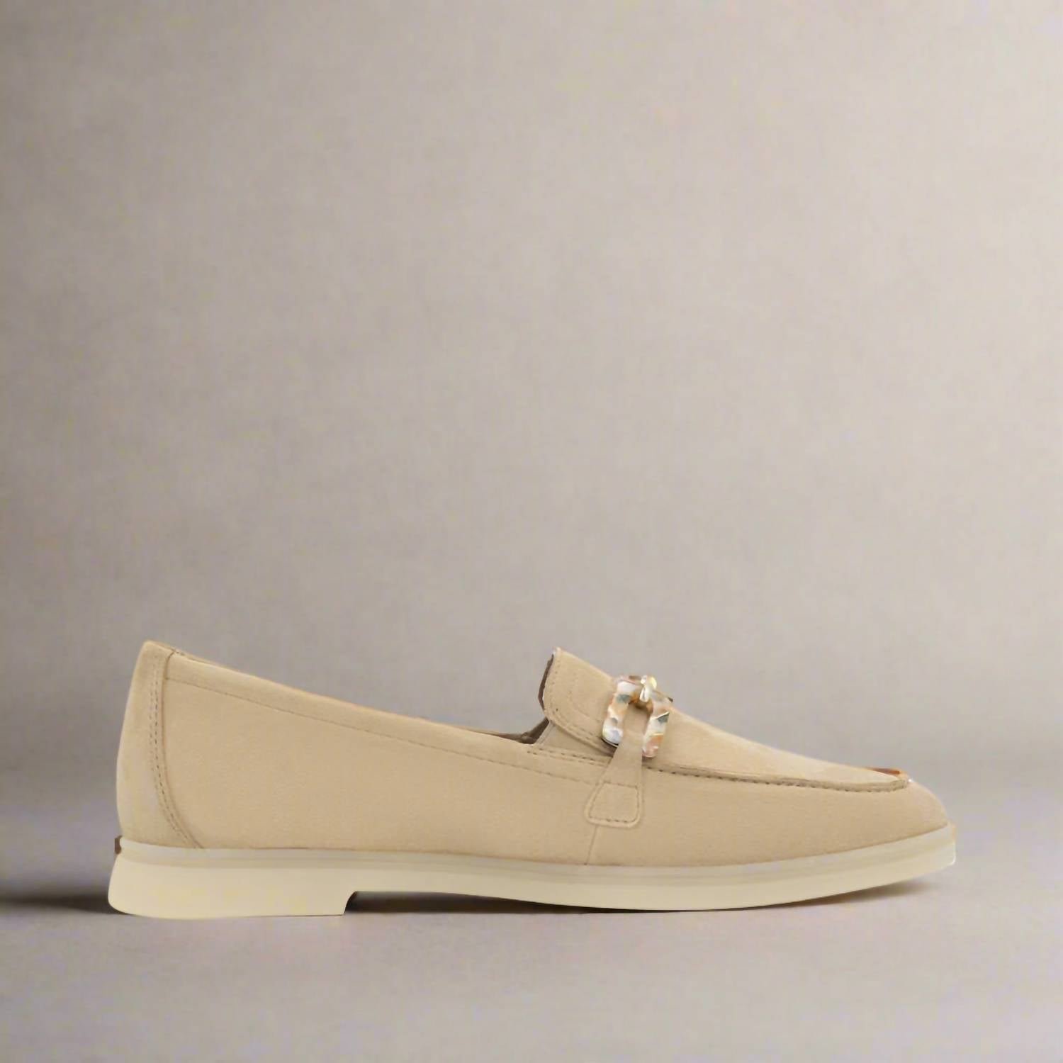 Loafers so versatile you can wear them with just about anything.Introducing the Women’s Loafers by Remonte, a chic addition to any wardrobe with a vintage flair. These loafers are crafted from soft beige nubuck suede, featuring a resin chain detail that adds a touch of elegance. Designed for comfort, these shoes have a round toe and flat heel, making them perfect for vacations or spring outings. Shoe width is medium, ideal for those seeking a stylish yet practical choice.